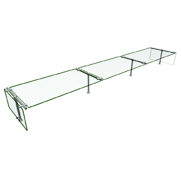 The Hatco ES53-108 Flav-R-Shield® ES53 Food Shield is a stationary double-sided self-service unit, meticulously crafted to meet the needs of diverse food service environments. This product features three bays, measuring 108 inches in width and 20 inches in depth, with adjustable heights up to 54 inches. Constructed with heat-tempered glass throughout, it offers superior durability, featuring 3/4-inch radius corners and polished edges for a sleek appearance. The glass top shelf and end panels are 3/8 inches thick, contributing to its robust design. The structural integrity is further enhanced by 1-inch outer diameter brushed 304 stainless steel posts, ensuring stability and longevity. As an NSF component, this food shield station adheres to stringent public health standards, making it a reliable choice for maintaining hygiene and safety in food service settings. Proudly made in the USA, the Hatco ES53-108 is a versatile solution, well-suited for cafeterias, buffets, and self-service stations, where both aesthetics and functionality are paramount. Its thoughtful design, combining quality materials and practical dimensions, makes it an invaluable addition to any professional kitchen seeking to enhance their service area with a reliable and visually appealing food shield.