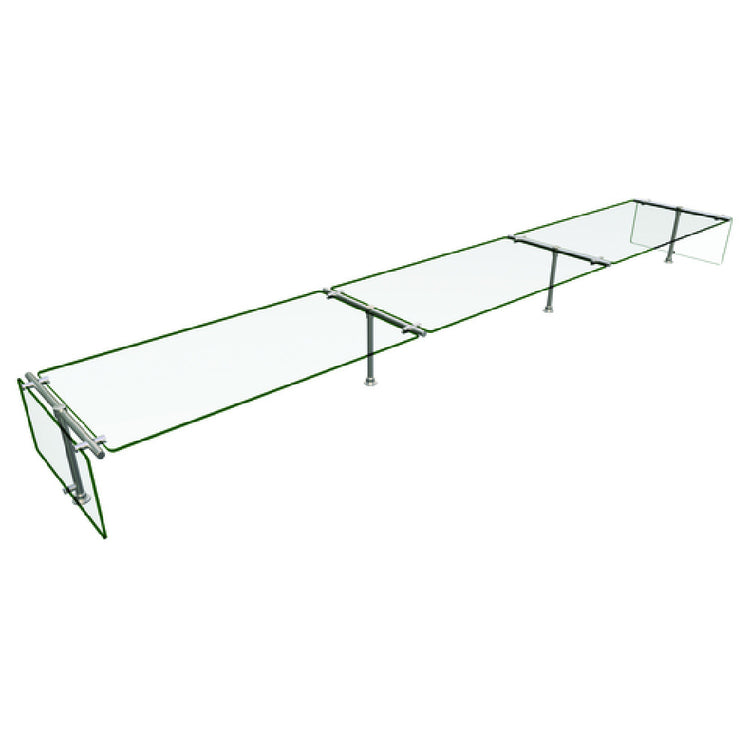 The Hatco ES53-120 Flav-R-Shield® ES53 Food Shield - stationary double-sided self service unit is designed for optimal display and protection in various food service settings. With a substantial span of 120 inches in width and a depth of 20 inches, this food shield can be adjusted to a height of up to 54 inches, accommodating a range of service requirements. Its heat-tempered glass construction guarantees durability and safety, featuring three bays with 3/4-inch radius corners and polished edges for a sleek appearance. The glass top shelf and end panels are crafted from 3/8-inch thick glass, ensuring stability and a clear view of the food displays for patrons on both sides. Supported by 1-inch OD brushed 304 stainless steel posts, this unit stands as a robust and reliable choice for establishments prioritizing hygiene and aesthetic appeal. Notably, the Hatco ES53-120 is an NSF-certified component, highlighting its compliance with high standards of food safety. Proudly made in the USA, this food shield is ideal for self-service stations in cafeterias, buffets, and other food service venues, providing a versatile and durable solution for efficient and appealing food presentation.