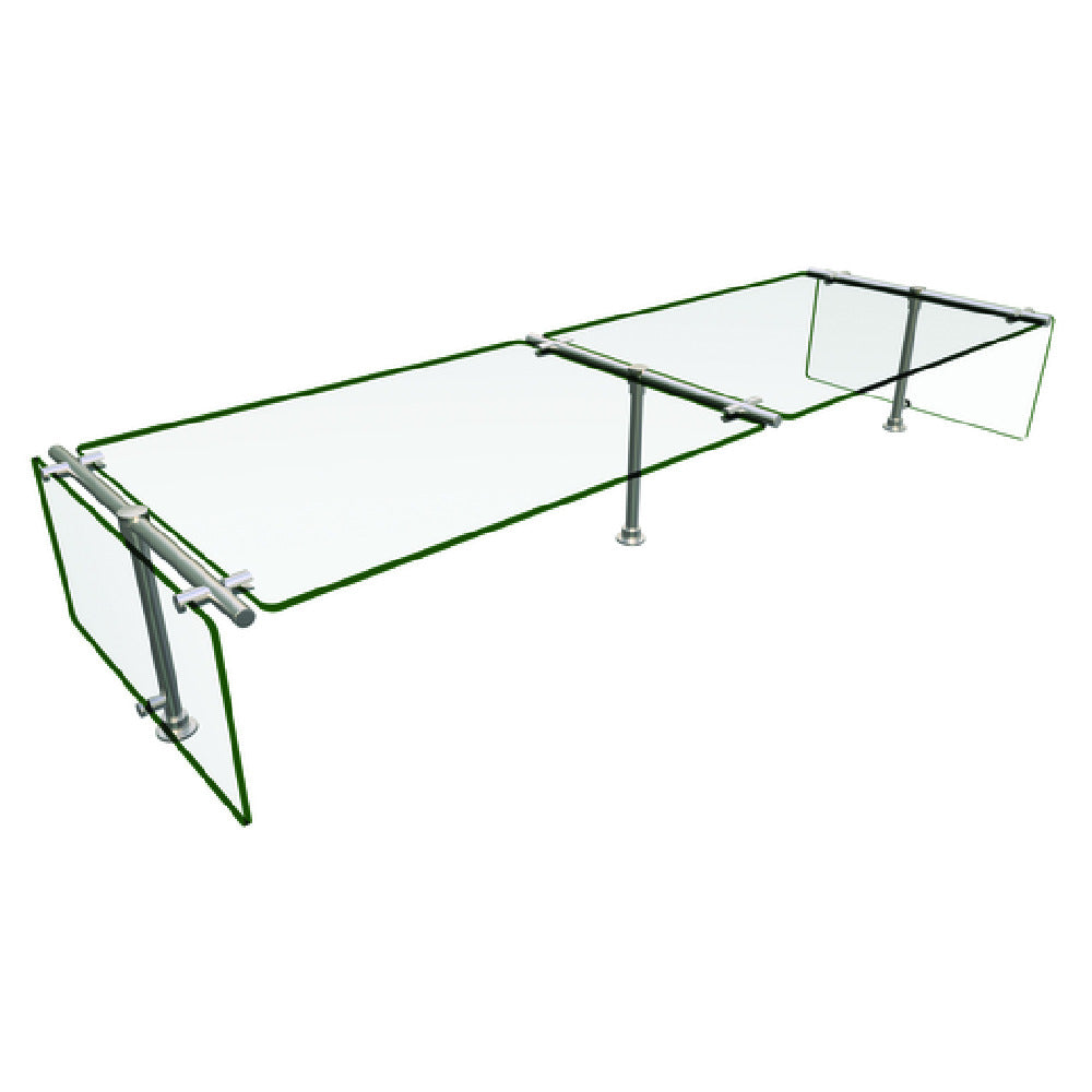 The Hatco ES53-60 Flav-R-Shield® ES53 Food Shield is a stationary, double-sided self-service unit designed for optimal functionality and durability in various food service settings. This model features two bays with dimensions of 60 inches in width and 20 inches in depth, and it is adjustable up to a height of 54 inches, providing ample space and flexibility for different display needs. The product is constructed entirely from heat-tempered glass, ensuring strength and safety, with 3/4-inch radius corners and polished edges that add a sleek, professional appearance. The 3/8-inch thick glass top shelf and end panels enhance durability, while the 1-inch OD brushed 304 stainless steel posts contribute to its robust structure. Certified as an NSF component, this food shield meets strict public health and safety guidelines, making it a reliable choice for professional kitchens and food service environments. Proudly made in the USA, the Hatco ES53-60 Flav-R-Shield® provides a high-quality solution for establishments seeking to maintain hygiene and presentation standards, catering to needs in segments such as restaurants, cafeterias, and self-service food stations.