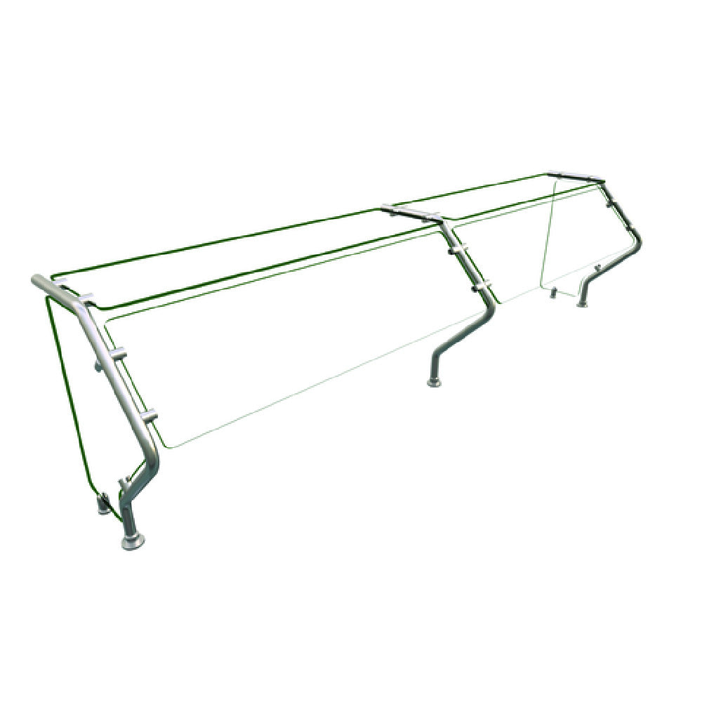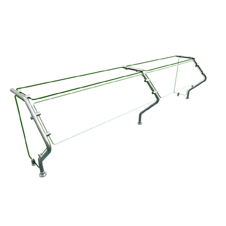 The Hatco ES73-84 Flav-R-Shield® ES73 Food Shield Self Service unit is engineered to enhance self-service dining environments with its dual-bay configuration measuring 84 inches in width, 19 inches in depth, and 24 inches in height. This food shield is meticulously crafted with heat-tempered glass throughout, ensuring both durability and safety in high-traffic areas. It features 3/4-inch radius corners and polished edges, which not only provide a sleek aesthetic but also minimize potential injury risks. The top shelf is constructed from 1/4-inch thick glass, accompanied by glass front and end panels, which contribute to a clear and unobstructed view of the displayed items. For added structural integrity, the unit is supported by 1-inch outer diameter brushed 304 stainless steel posts, known for their robustness and resistance to corrosion. As an NSF component, the Hatco ES73-84 Flav-R-Shield meets stringent public health standards, reinforcing its suitability for professional food service settings. Proudly made in the USA, this food shield is an exemplary choice for establishments seeking reliable and visually appealing food protection solutions, catering to the diverse needs of cafeterias, buffets, and self-service restaurants.