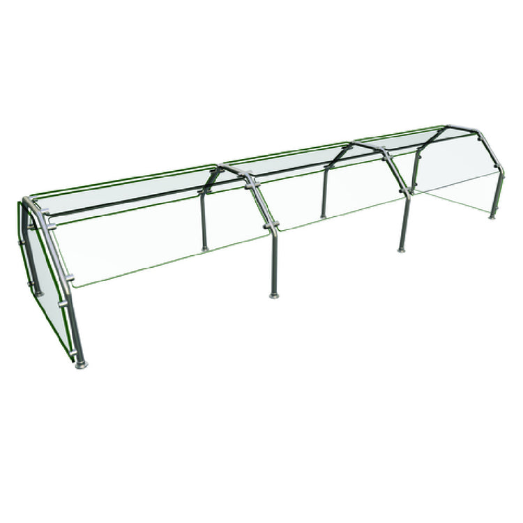 The Hatco ES82-108 Flav-R-Shield® ES82 Food Shield is a double-sided self-service unit designed with precise engineering for optimal food display and protection. Measuring 108 inches in width, 38 inches in depth, and 23 inches in height, this food shield is ideal for food service environments that require both visibility and access. Constructed with 3/8-inch thick heat-tempered glass, it features 3/4-inch radius corners and polished edges, ensuring both durability and a sleek appearance. The inclusion of a glass top shelf, along with front and back panels, enhances the display capabilities while maintaining safety standards. Side panels provide additional protection, making it suitable for high-traffic self-service areas. Built with 1-inch OD brushed 304 stainless steel posts, its structure is both robust and aesthetically pleasing. This unit is NSF component certified, highlighting its adherence to stringent public health and safety standards. Proudly made in the USA, the Hatco ES82-108 is a versatile solution for buffet setups, cafeterias, and other food service applications that demand a combination of style, accessibility, and compliance with hygiene standards.
