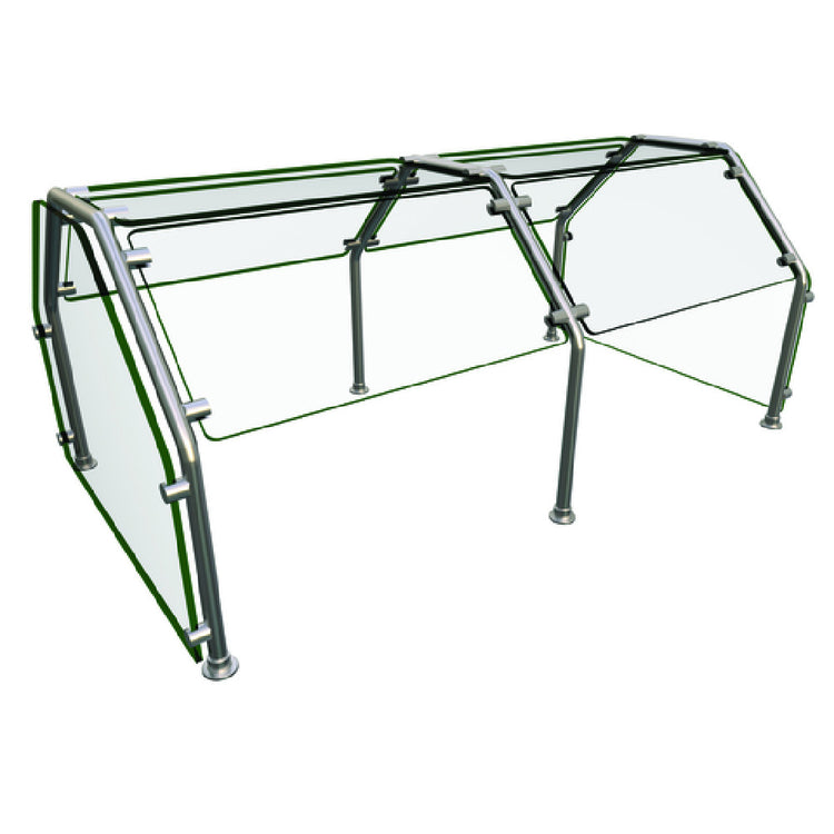 The Hatco ES82-48 Flav-R-Shield® ES82 Food Shield is a double-sided self-service unit, meticulously designed for versatility across various industry segments. Measuring 48 inches in width, 38 inches in depth, and 23 inches in height, this food shield provides ample coverage and protection for food presentations. Its robust construction features 3/8-inch thick heat-tempered glass throughout, ensuring durability and safety, with 3/4-inch radius corners and polished edges for a sleek finish. This model includes a glass top shelf along with front, back, and side glass panels, offering full visibility and easy access from both sides. Supported by 1-inch outer diameter brushed 304 stainless steel posts, the ES82-48 ensures stability and elegance. As an NSF component, it adheres to rigorous health and safety standards, underscoring its suitability for high-demand environments. Proudly made in the USA, the Hatco ES82-48 Flav-R-Shield® ES82 Food Shield is an exceptional choice for establishments that prioritize quality and reliability in food service presentations, such as cafeterias, buffet lines, and self-service restaurants. Its thoughtful design not only enhances food safety but also seamlessly integrates into various settings, making it a valuable addition to any professional food service operation.