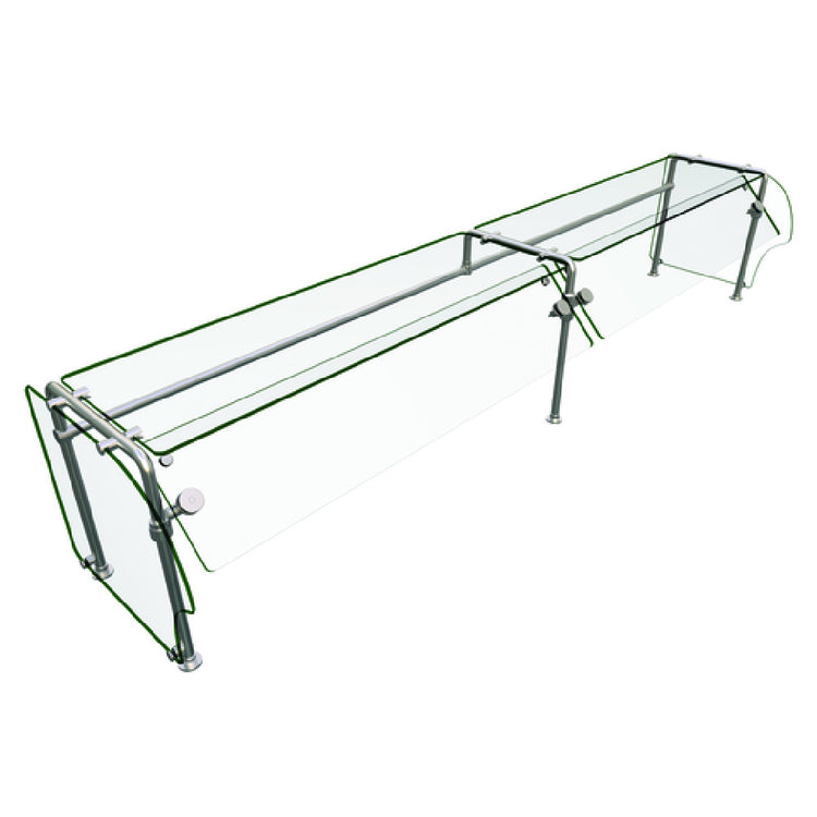 The Hatco ES90-108 Flav-R-Shield® ES90 Food Shield Self-service 108"W x 24"D x 22.63"H is a meticulously engineered product tailored for diverse segments within the food service industry. This food shield features heat-tempered glass construction throughout, ensuring durability and safety with its 3/4" radius corners and polished edges. The 3/8" thick glass top shelf provides a sturdy platform designed for high-traffic self-service environments. Its adjustable front panel and side panels enhance versatility, allowing for customizable configurations to suit various operational needs. Supported by 1" OD brushed 304 stainless steel posts, the Flav-R-Shield® exhibits a robust framework, combining elegance with long-lasting performance. As an NSF-certified component, this food shield meets stringent public health and safety standards, affirming its suitability for professional kitchens and food service operations. Proudly made in the USA, the Hatco ES90-108 represents a commitment to quality craftsmanship, making it an ideal choice for establishments seeking reliable and aesthetically pleasing food protection solutions. Whether utilized in restaurants, cafeterias, or buffets, this food shield delivers exceptional value through its thoughtful design and practical features, catering to the specific demands of the industry while ensuring an enhanced service experience.