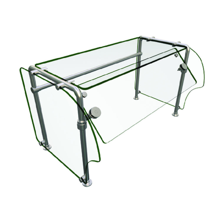 The Hatco ES90-36 Flav-R-Shield® ES90 Food Shield is a versatile and high-quality self-service solution, designed with dimensions of 36"W x 24"D x 22.63"H, making it suitable for various food service environments. Its construction features heat-tempered glass throughout, providing durability and safety, with 3/4" radius corners and polished edges that enhance its aesthetic appeal while ensuring user safety. The 3/8" thick glass top shelf provides a sturdy platform for food display, and the adjustable front panel and side panels allow for customizable configurations to suit different serving needs. Supported by 1" OD brushed 304 stainless steel posts, this food shield offers robust stability and complements the sleek glass design. It is NSF component certified, ensuring compliance with stringent public health and safety standards. Manufactured in the USA, the Hatco ES90-36 Flav-R-Shield® is an excellent choice for restaurants, cafeterias, and other self-service food establishments seeking a reliable and elegant solution for protecting and displaying food items. Its combination of technical precision and high-quality materials makes it a valuable asset in any setting where food safety and presentation are paramount.