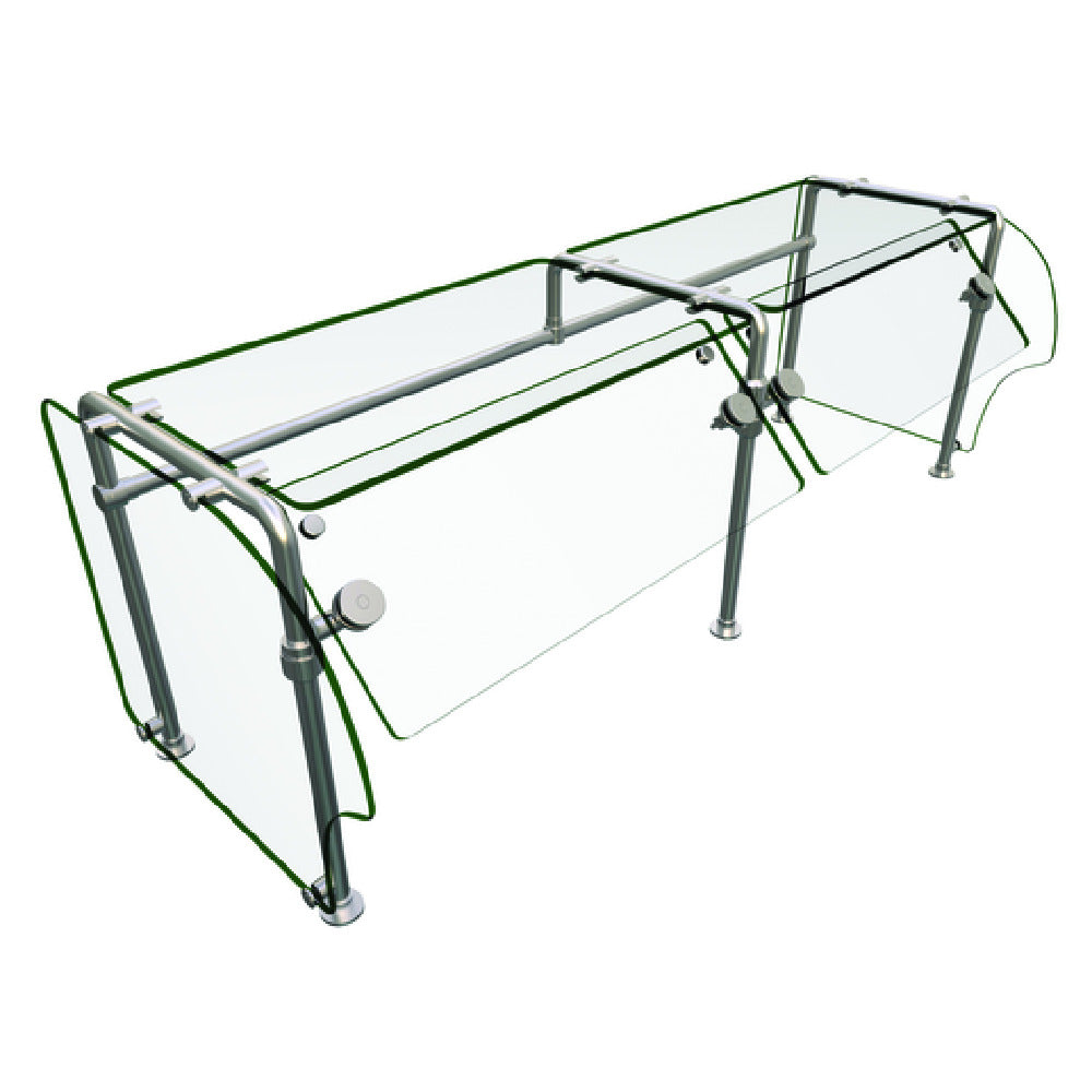 The Hatco ES90-60 Flav-R-Shield® ES90 Food Shield is a self-service unit measuring 60"W x 24"D x 22.63"H, expertly designed for versatility and safety within the food service industry. Crafted entirely from heat-tempered glass, this food shield features 3/4" radius corners and polished edges, ensuring both durability and a sleek appearance. The 3/8" thick glass top shelf provides robust support for displaying food items, while the adjustable front and side panels offer flexibility in setup and accessibility. The shield is supported by 1" OD brushed 304 stainless steel posts, which ensure stability and resistance to corrosion, making it a long-lasting asset in busy environments. This product is NSF component certified, emphasizing its compliance with high public health and safety standards, and is proudly made in the USA, reflecting its quality craftsmanship. The Hatco ES90-60 Flav-R-Shield® ES90 Food Shield is particularly suited for self-service settings, such as buffets and cafeterias, where hygiene and ease of access are paramount. Its combination of superior materials and thoughtful design makes it a reliable choice for establishments aiming to enhance their service capabilities while maintaining an appealing presentation.