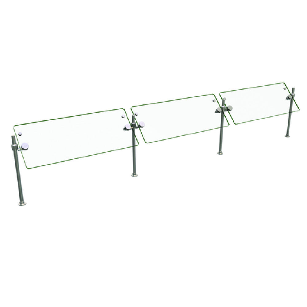 The Hatco ORBIT360-108 Flav-R-Shield® ORBIT360 Food Shield is a self-service unit designed with three bays, providing a substantial width of 108 inches and adjustable depth ranging from 2 to 14 inches. Its height is fixed at 23 inches, making it a versatile choice for various serving environments. The shield is constructed entirely from heat-tempered glass, ensuring durability and safety in high-traffic areas. Key design features include 3/4-inch radius corners and polished edges, offering a sleek and modern aesthetic. The front panel is 3/8-inch thick and adjustable, complemented by a rotating face panel and additional circular openings, which allow for optimal height adjustment and user convenience. The ORBIT360-108 is supported by 1-inch OD brushed 304 stainless steel posts, complete with mounting feet for secure installation. This product is NSF certified, highlighting its compliance with health and safety standards, and is proudly made in the USA. The Hatco ORBIT360-108 Flav-R-Shield® is ideal for establishments requiring robust and flexible food protection solutions, such as buffets, cafeterias, and self-service stations, offering a combination of style, functionality, and safety that caters to diverse market segments within the food service industry.