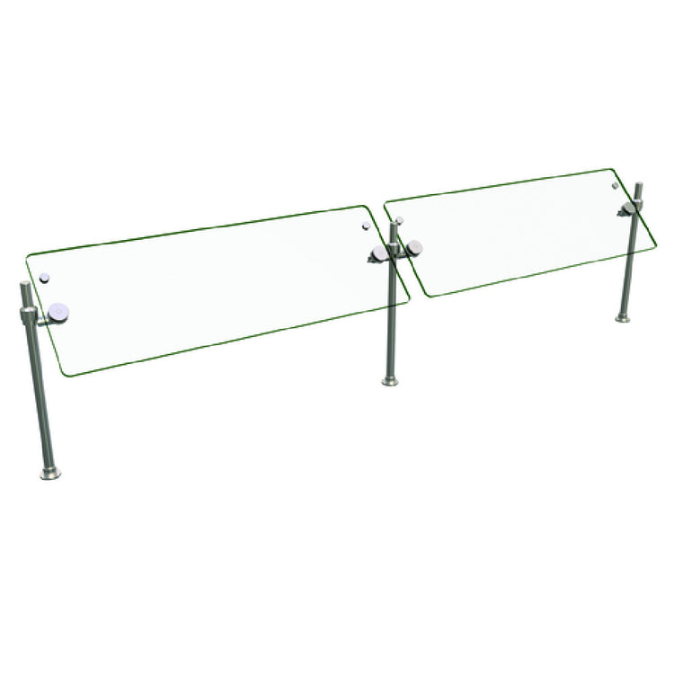 The Hatco ORBIT360-84 Flav-R-Shield® ORBIT360 Food Shield Self-Service is a meticulously engineered product designed for optimal self-service functionality, measuring 84 inches wide with an adjustable depth of 2 to 14 inches and a height of 23 inches. Crafted entirely from heat-tempered glass, it features 3/4-inch radius corners and polished edges for enhanced safety and aesthetics. The adjustable front panel, 3/8-inch thick, includes a rotating face panel and circular openings, offering superior adjustment for varied service needs. Supported by 1-inch OD brushed 304 stainless steel posts with mounting feet, it provides robust stability and durability. This food shield also carries an NSF component certification, underscoring its adherence to stringent public health and safety standards. Proudly made in the USA, the ORBIT360-84 is an exemplary choice for businesses in the food service industry seeking a reliable and customizable solution for self-service food protection. Its high-quality construction and adjustable features make it suitable for varied applications, delivering precision and performance expected in professional settings. The ORBIT360-84's thoughtful design, combining aesthetic appeal with technical prowess, ensures it stands out as a premier choice for efficient and safe food service operations.