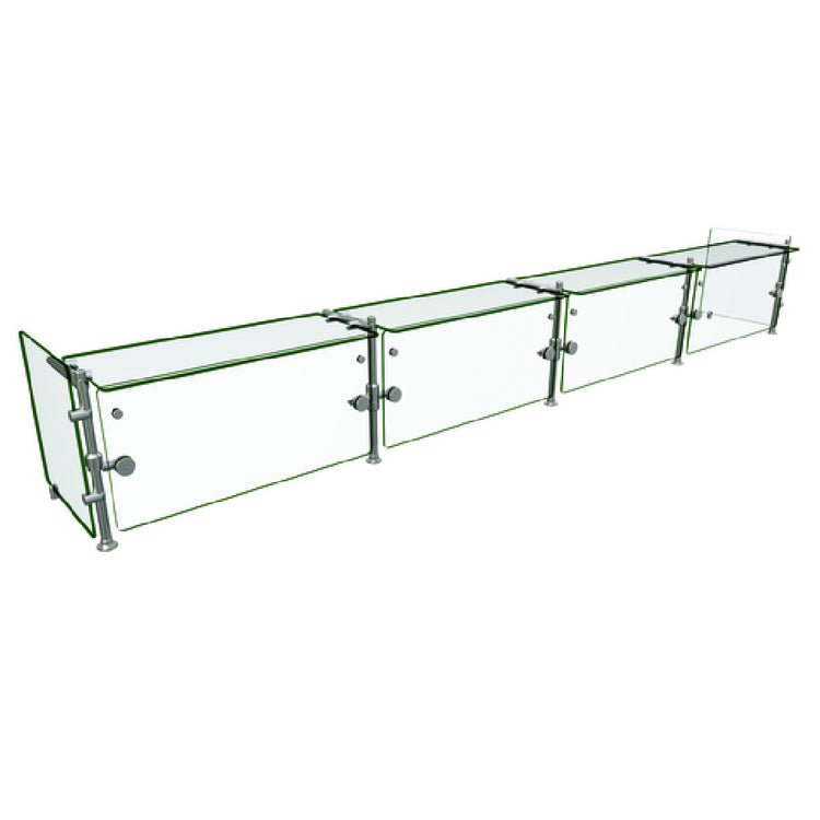 The Hatco ORBIT900-13224 Flav-R-Shield® ORBIT900 Food Shield stands as a distinguished choice within the food service industry, designed for full service with an impressive configuration of 4 bays measuring 132 inches in width by 24 inches in depth. Its height is adjustable up to 23 inches, allowing for versatility in diverse service environments. This food shield is constructed with 3/8-inch thick heat-tempered glass, ensuring durability and safety, while its 3/4-inch radius corners and polished edges reflect meticulous craftsmanship. The inclusion of a glass top shelf, along with front and side panels, contributes to its comprehensive design, offering both protection and visibility. It is supported by 1-inch OD brushed 304 stainless steel posts, emphasizing stability and a sleek finish. As an NSF component, it meets strict standards for public health protection, making it a reliable choice for maintaining hygiene and safety in food display settings. Proudly made in the USA, the Hatco ORBIT900-13224 Flav-R-Shield® ORBIT900 is ideal for establishments seeking a sophisticated, durable solution for their food presentation needs, seamlessly blending form with function for unparalleled service quality.