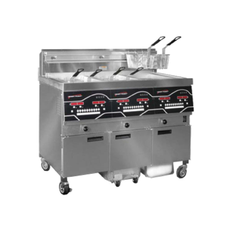 The Henny Penny EEG243.0_LP Evolution Elite® Open Fryer Gas (3) Wells is a high-performance frying solution designed for commercial kitchens demanding efficiency and reliability. This fryer features three wells, each with a 30 lb. capacity per full vat, making it suitable for large-scale frying operations. The Oil Guardian™ automatic oil top-off system ensures consistent oil levels, enhancing cooking quality and safety. Integrated iControl™ technology includes ten programmable cook cycles, offering customization and efficiency in food preparation. The LED display provides clear operational visibility, while the SmartFilter Express™ oil filtration system, equipped with two filter pads and a Filter Beacon®, promotes optimal oil purity and extends oil life. Constructed from durable stainless steel, this fryer is built to withstand the rigors of a busy kitchen environment. It is equipped with four swivel casters, two of which are locking, for easy mobility and secure placement. Certified by cULus, UL EPH, CE, and carrying the ENERGY STAR® rating, the Henny Penny EEG243.0_LP promises energy efficiency and compliance with safety standards. Its robust design and advanced features make it a valuable asset for various segments within the food service industry, catering to specific needs with technical precision.