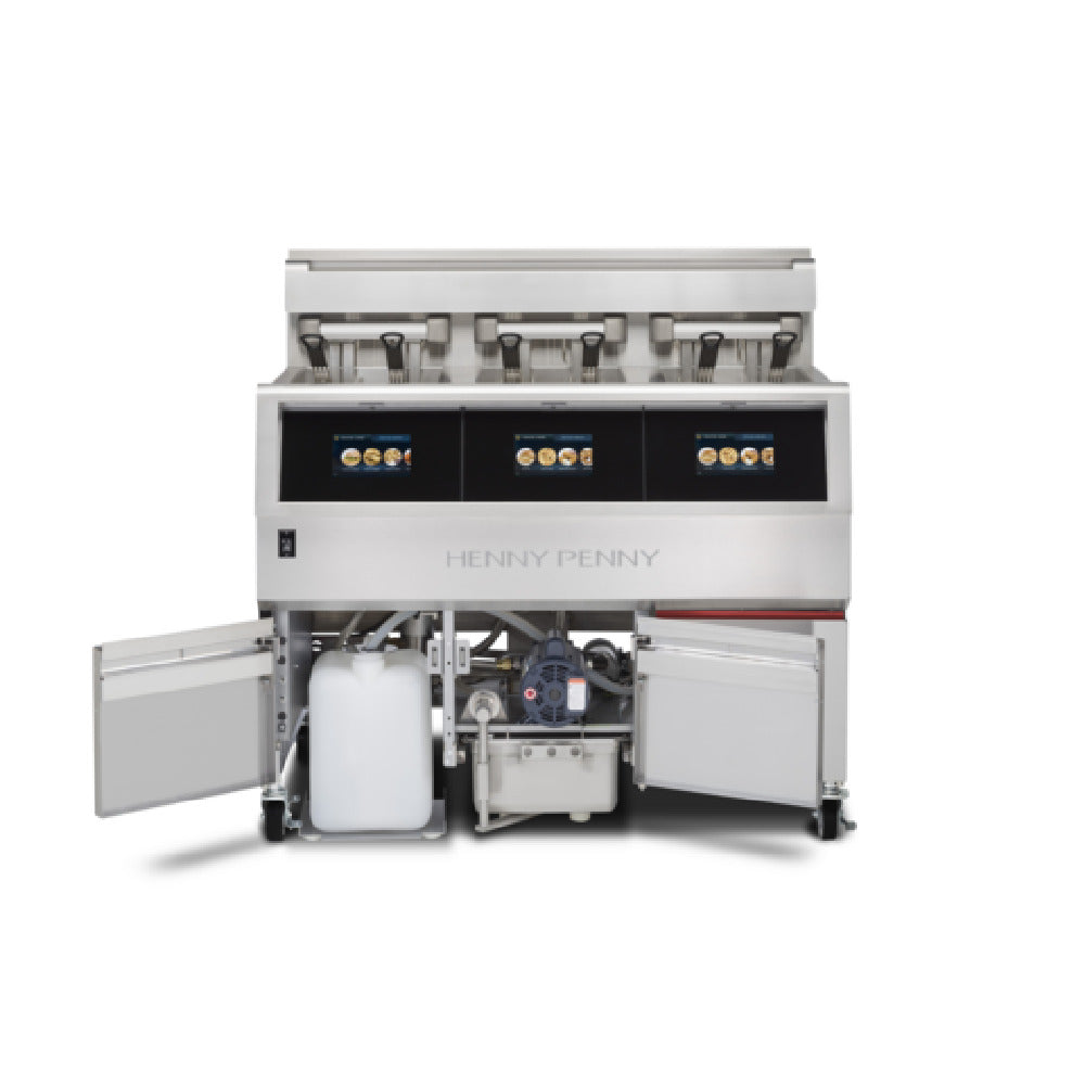 The Henny Penny OFE513.0 OFE-513 Open Fryer Electric (3) Wells is a versatile and efficient cooking solution, particularly beneficial for commercial kitchens needing to maximize frying capacity. Each of its three wells boasts a 30 lb. capacity per full vat, facilitating the preparation of large batches simultaneously, essential for high-demand environments. The fryer features a 7" LCD touchscreen, allowing easy navigation through its extensive 99 cooking programs, making it adaptable for diverse culinary requirements. Its built-in filter system ensures cooking oil longevity and quality, enhancing operational efficiency and reducing waste. Constructed from durable stainless steel, the unit promises longevity and resilience in busy kitchen settings. The inclusion of four casters, two of which are locking, provides mobility and stability, essential for dynamic kitchen layouts. The package comes with one basket support for each vat, an element lift tool, and an operating manual, ensuring comprehensive utility and ease of use. Certified by cULus, UL EPH, CE, and ENERGY STAR®, this fryer meets stringent safety, health, and energy efficiency standards, making it a reliable and responsible choice for professional food service operations looking to optimize their frying processes.