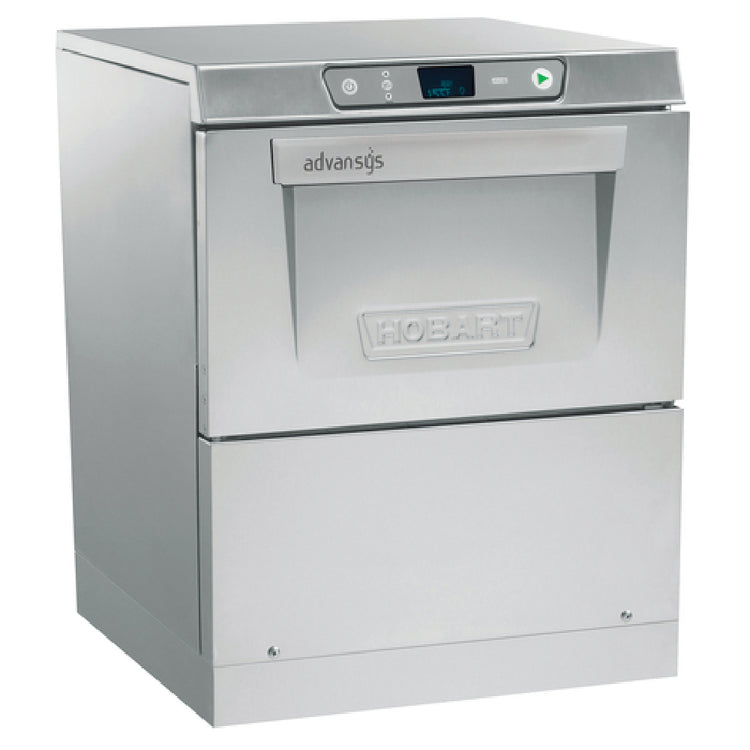 The Hobart LXGEPR-3 ADA COMPLIANT (Kickplate ADA) is meticulously designed to fit under an ADA counter height of 34 inches, providing seamless integration into compliant commercial kitchens and bars. This Advansys™ Undercounter Dishwasher/Glasswasher features the advanced Puri Rinse technology with cold water sanitization, ensuring hygiene with an efficient use of 1.14 gallons per rack. With the capability to handle 38 or 29 racks per hour, it supports high-volume operations. Key automated features include Auto Delime notification and cycle, Auto Chemical Priming, and integrated pumps for detergent, rinse aid, sanitizer, and delime agents. It offers two programmable cycles tailored for different cleaning needs, and advanced service diagnostics for easy maintenance. The electric tank heat operates at 120/60/1 electrical specifications. Installation must comply with ADA guidelines for full compliance. The package includes one peg rack and one combination rack, enhancing its versatility. Additionally, Hobart provides free factory startup within a 100-mile radius of a Hobart service office, with installations beyond this range charged at a quoted rate. This unit is an ideal solution for businesses prioritizing both efficiency and compliance in their dishwashing operations.
