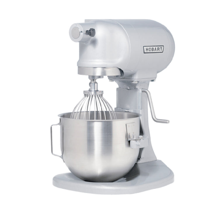 The Hobart N50-651 100-120/60/1 Mixer with Bowl Aluminum Beater Whip & Dough Arm is a versatile and robust planetary bench mixer, tailored to meet the diverse needs of culinary professionals and industrial kitchens. Featuring a 5-quart capacity and three fixed speeds, this mixer efficiently handles various mixing tasks. Its gear-driven transmission ensures consistent performance, while the #10 taper attachment hub offers flexibility for additional attachments. The mixer's manual bowl lift simplifies operation, and its Hobart Grey enamel housing provides durability and a professional appearance. The package includes a stainless steel bowl, an aluminum "B" beater, a stainless steel "D" wire whip, and an aluminum dough hook, catering to a wide range of mixing requirements from whipping cream to kneading dough. With a 1/6 HP motor and a cord with plug, the mixer is designed for reliability and ease of use. The Hobart N50-651 is configured for Canada and its robust construction and versatile capabilities make it an essential tool for bakeries, pastry shops, and other food service operations, delivering exceptional quality and performance.