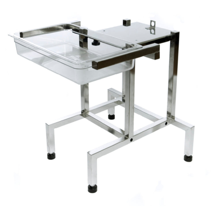 The Hobart TABLE-FP Food Processor Stand is an expertly designed mounting solution for the FP100, FP150, FP250, or FP350 food processing machines. This stand is uniquely equipped to hold the PLASTIC-PAN accessory, effectively facilitating the collection of processed products. For added versatility, the tray arms of the TABLE-FP are easily removable, allowing seamless integration with the PRODUCT-CART accessory. This setup is ideal for a variety of food service environments where mobility and adaptability are crucial. Included with the stand is a plastic tray, enhancing the product's utility and ensuring that processed goods are efficiently managed. The Hobart TABLE-FP is an essential addition for professional kitchens, catering services, and food production facilities seeking to optimize their workflow with reliable and flexible equipment. Its practical design supports a range of food processor models, making it a versatile choice within the industry. Endorsed by Hobart's commitment to quality, this stand is a valuable asset for businesses looking to enhance their food processing operations with a focus on efficiency and organization.