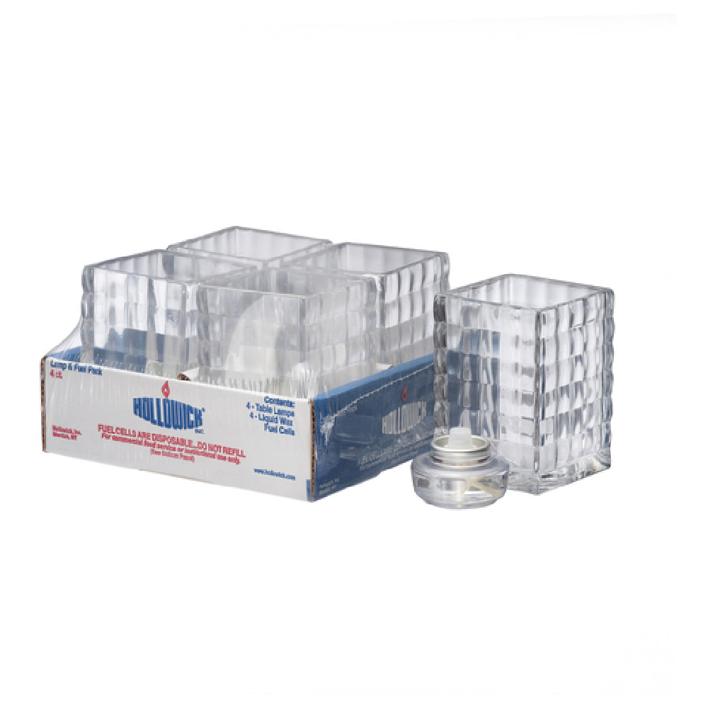 The Hollowick 1533C-4 Cash & Carry Optic Block™ Lamp is a uniquely designed illumination solution measuring 2-5/8 inches in width and 3-3/4 inches in height. This square lamp is paired with HD12 Liquid Votive™ fuel cells, ensuring a consistent and reliable light source. Constructed entirely from clear glass, the lamp excels in providing an unobstructed glow, enhancing the ambiance in various settings. Each pack comprises four lamps, making it an economical choice for bulk buyers. This product is particularly suitable for use in hospitality sectors such as restaurants and event venues, where a sleek and elegant lighting option is required. The compact design of the Hollowick 1533C-4 ensures it fits seamlessly on tabletops or counters, adding a sophisticated touch without occupying excessive space. Its versatility and clarity in design make it relevant for diverse market segments that value both aesthetic and functional lighting solutions.