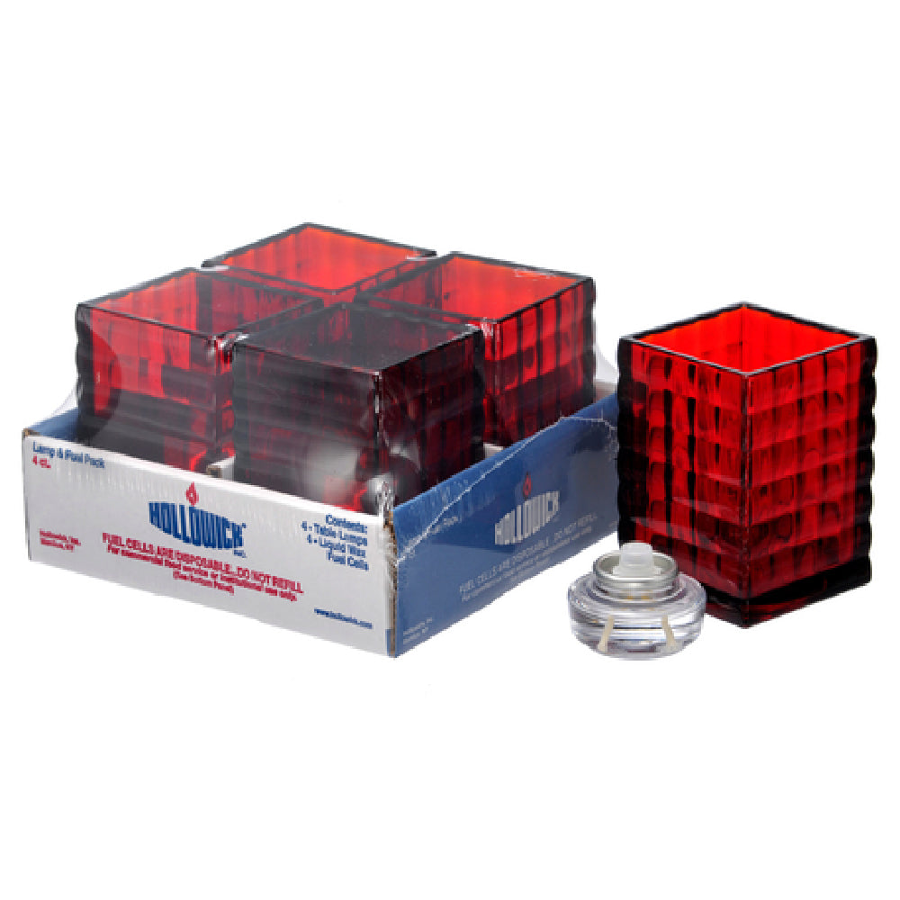 The Hollowick 1533R-4 Cash & Carry Optic Block™ Lamp is a meticulously designed lighting solution measuring 2-5/8 inches in width and 3-3/4 inches in height. This square-shaped lamp is crafted from high-quality glass and comes in a striking ruby color, adding a touch of elegance and sophistication to any setting. It is equipped with HD12 Liquid Votive™ fuel cells, ensuring reliable and efficient illumination. Packaged as four lamps per pack, this product is ideal for various market segments, including hospitality, restaurant, and event planning industries, where ambient lighting is crucial. The lamp's compact size and vibrant hue make it a versatile choice for enhancing table settings, creating a warm and inviting atmosphere. The Hollowick 1533R-4 is particularly valuable for businesses seeking a cost-effective yet stylish lighting option that complements their decor while maintaining high standards of functionality and aesthetic appeal. Its practical design and efficient fuel cell technology make it an excellent choice for professionals looking to enhance customer experiences through thoughtful and attractive lighting solutions.