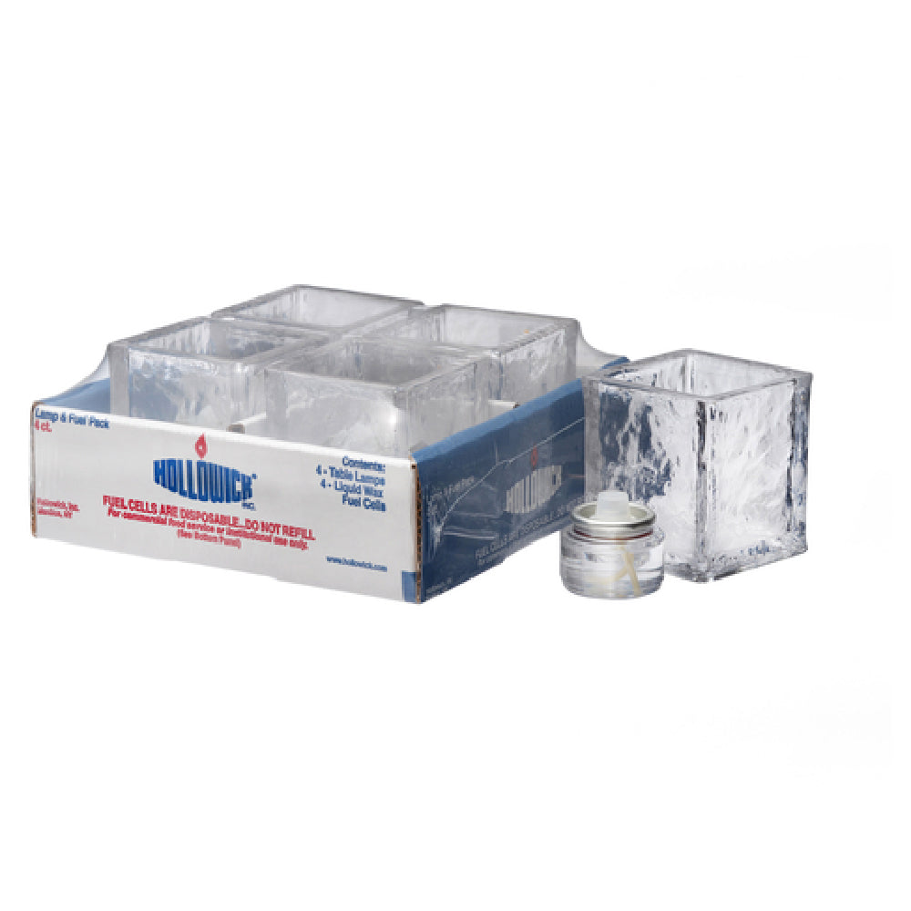 The Hollowick 5180C-4 Cash & Carry Glacier™ Tealight Lamp is a compact and elegantly designed lighting solution, measuring 2-3/8 inches in width and 2-3/4 inches in height. It is crafted in a square shape from clear glass, providing a modern and sophisticated aesthetic perfect for various settings, from intimate dining environments to stylish retail displays. Each pack contains four tealight lamps, each accompanied by HD8 Liquid Tealight™ fuel cells, ensuring a consistent and safe flame. This product is particularly advantageous for restaurant owners and event planners seeking a reliable and atmospheric lighting option. The inclusion of liquid tealight fuel cells means these lamps offer a clean burn without the mess or hazards associated with traditional wax candles. The Hollowick 5180C-4 is not just a visual enhancement but a practical lighting solution that addresses the needs of efficiency and style in both commercial and personal settings. Whether used to enhance the ambiance of fine dining establishments or to add a touch of elegance to special occasions, this tealight lamp stands out as a versatile and durable choice in the lighting industry.