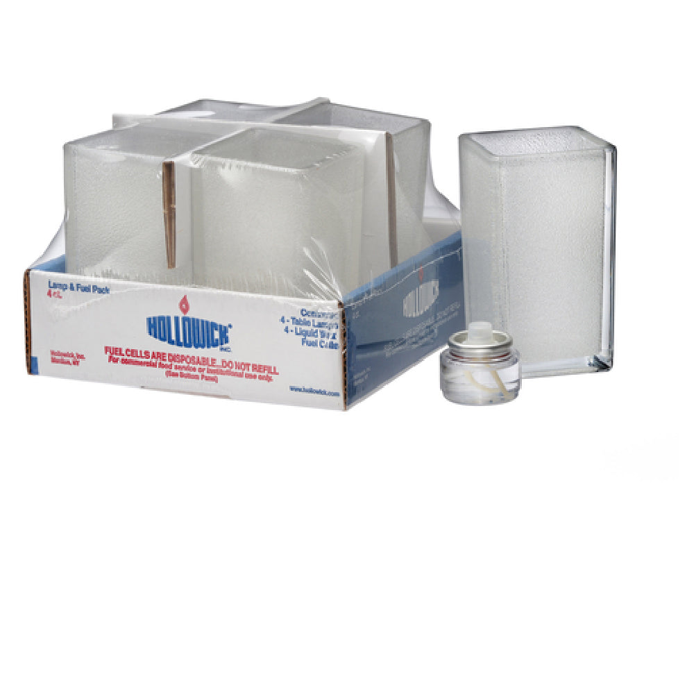 The Hollowick 6109CJ-4 Cash & Carry Quad™ Votive Lamp is a sophisticated lighting solution designed for versatility and elegance across various market segments. Standing at 4-3/8 inches in height and measuring 2-1/2 inches square, this votive lamp effortlessly complements any setting with its compact and stylish design. Crafted from clear jewel glass, it exudes a timeless aesthetic that enhances ambiance. Each pack includes four units, each accompanied by the HD8 Liquid Tealight™ fuel cells, ensuring a consistent and long-lasting illumination. This votive lamp is particularly suited for hospitality environments like restaurants, hotels, and event spaces where subtle, yet impactful lighting is essential. With its easy-to-use Cash & Carry design, it is also ideal for retail environments looking to provide customers with a premium, ready-to-use lighting option. The combination of high-quality materials and efficient fuel cells makes the Hollowick 6109CJ-4 a reliable and elegant choice for both commercial and personal use, ensuring that any environment is gracefully illuminated. The blend of functional size and refined design underscores its unique value proposition, catering to diverse lighting needs and enhancing the overall aesthetic of any space it graces.