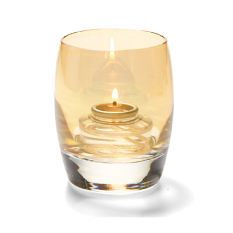 The Hollowick 6404G Contour™ Votive 3-3/4"H x 3" Dia. Glass is a sophisticated lighting accessory designed to enhance ambiance across various settings. Measuring 3-3/4 inches in height and 3 inches in diameter, this votive holder is crafted from high-quality glass and features a distinctive gold lustre finish that adds a touch of elegance. It is specifically designed to accommodate Hollowick's HD8, HD12, or HD15 fuel cells, making it a versatile choice for providing consistent and safe illumination. This product is particularly valued in the hospitality industry, where it serves as a stylish and functional solution for restaurants, hotels, and event venues looking to create a warm and inviting atmosphere. Its compatibility with different fuel cell sizes offers flexibility, catering to varying lighting duration requirements and intensity preferences. The luxurious appearance of the gold lustre finish not only complements a wide range of decor styles but also ensures that the Hollowick 6404G Contour™ Votive serves as a focal point in any setting. This votive holder is ideal for both casual and formal occasions, offering a blend of practicality and aesthetic appeal that meets the diverse needs of professionals seeking reliable and elegant lighting solutions.