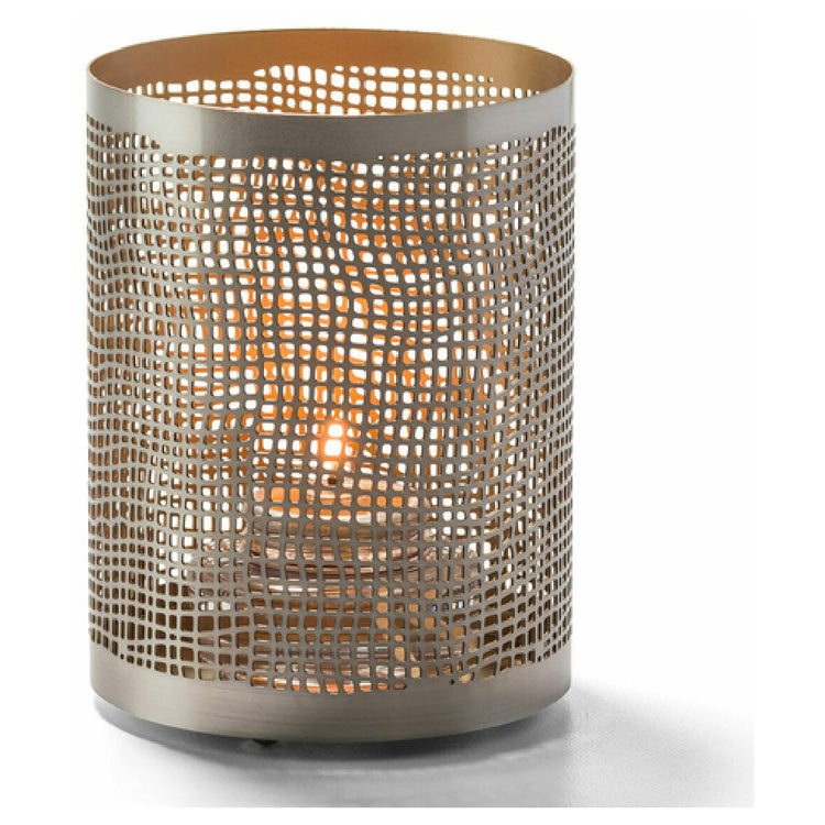 The Hollowick 6417 Chantilly™ Votive Lamp is a sophisticated lighting solution designed for diverse environments seeking a blend of style and functionality. Measuring 4 inches in height and featuring a 3-1/8 inch diameter, this cylindrical votive lamp is crafted from durable metal, ensuring longevity and high-quality performance. The lamp's distinctive perforated design adds a touch of elegance, making it a visually appealing centerpiece for any setting. Available in a striking combination of pewter and gold, it complements a wide range of aesthetic preferences. The Hollowick 6417 Chantilly™ Votive Lamp is compatible with Hollowick's HD12, HD17, or HD26 fuel cells, offering flexibility and convenience for users. This adaptability makes it ideal for use in restaurants, hotels, and event venues, where ambiance and reliable lighting are paramount. Its compact size and superior construction make it suitable for both intimate settings and larger venues, providing a warm and inviting atmosphere. The Hollowick 6417 Chantilly™ Votive Lamp stands out as a versatile and stylish choice for professionals in the hospitality industry, delivering both aesthetic appeal and practical functionality for various market segments.