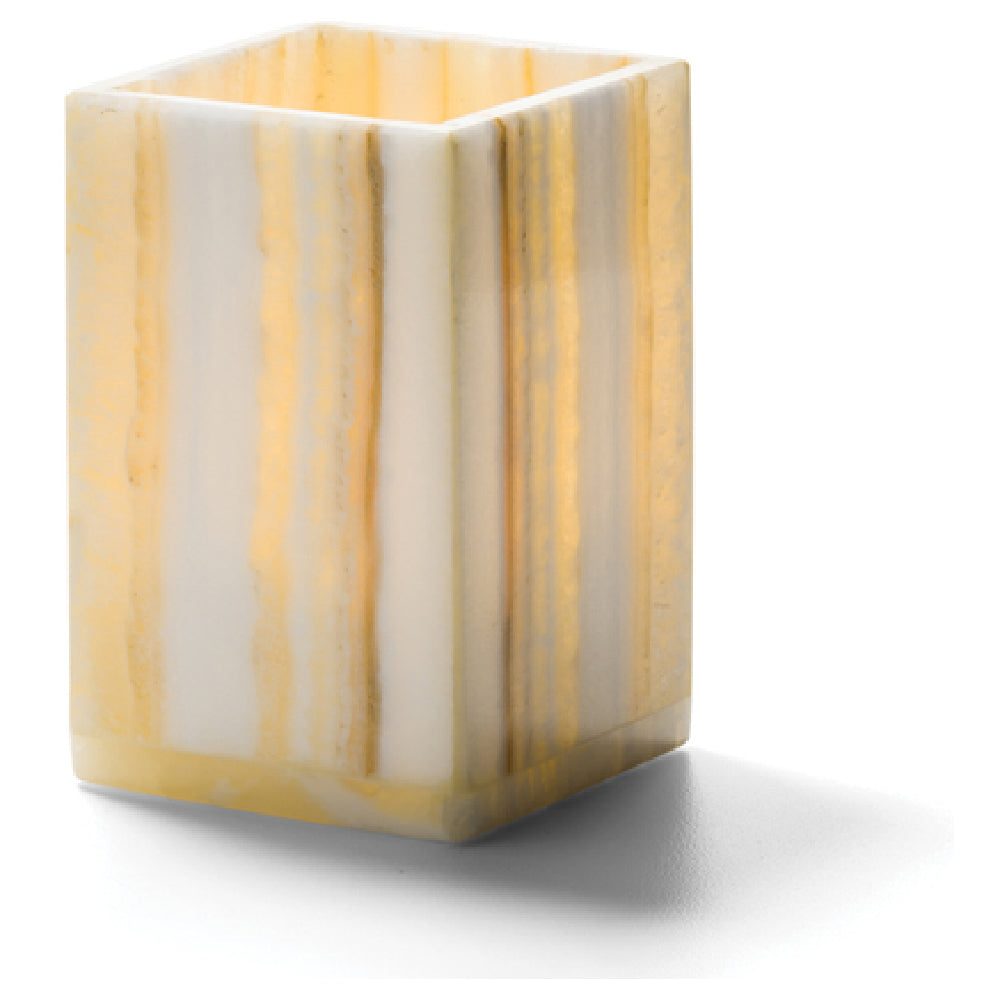 The Hollowick 8208EA Luxor™ Tealight Lamp is a meticulously crafted lighting solution, measuring 2-1/4 inches in width, 2-1/4 inches in depth, and 3-3/8 inches in height, with a distinctive square shape that adds a touch of elegance to any setting. Ideal for both commercial and residential atmospheres, this tealight lamp is designed to be used with Hollowick's HD8 fuel cells, ensuring a long-lasting and consistent illumination. Its alabaster construction not only enhances its aesthetic appeal but also diffuses light gently, creating a warm and inviting ambiance. The Luxor™ Tealight Lamp's compact design makes it a versatile choice for various segments within the hospitality industry, from intimate dining venues to grand banquet halls, as well as for home decorators seeking to add a subtle yet sophisticated lighting element. Its combination of size, material, and functionality underscores its adaptability and suitability for diverse lighting needs, making it a valuable addition to any setting that values both style and practicality in its lighting solutions.