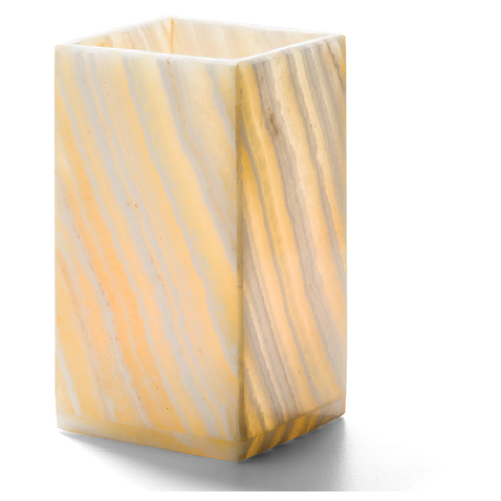 The Hollowick 8217EA Luxor™ Lamp, measuring 2-3/4"W x 2-3/4"D x 5"H, is a square, mid-size lighting solution designed for versatility and style. Crafted from alabaster, this lamp offers a sophisticated aesthetic that enhances any setting. It is specifically engineered to be used with Hollowick's HD12, HD17, or HD26 fuel cells, ensuring a reliable and consistent light source. The compact dimensions of 2-3/4 inches in width and depth, combined with a height of 5 inches, make it an ideal choice for environments requiring elegant lighting without occupying excessive space. This lamp is perfect for various segments within the hospitality and food service industries, providing ambient illumination for dining tables, bars, or hotel lobbies. The mid-size design ensures it fits seamlessly into both intimate and larger spaces, offering flexibility in use across different venues. The alabaster construction not only adds to its visual appeal but also complements various decor styles, enhancing the ambiance of the environment. The Hollowick 8217EA Luxor™ Lamp is a practical and stylish choice for industry professionals seeking to elevate the visual experience in their establishments with reliable and attractive lighting.