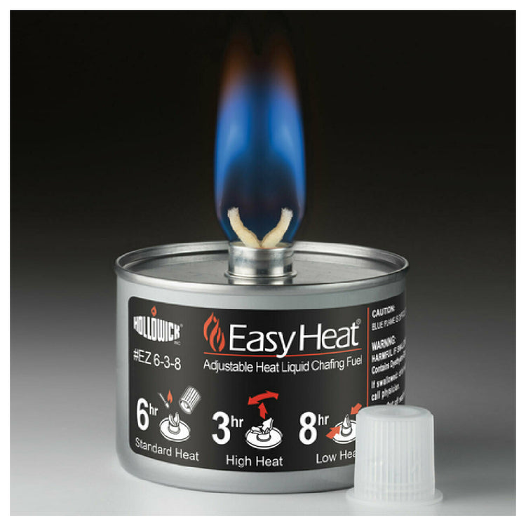 The Hollowick EZ 6-3-8 Easy Heat® Chafing Fuel is an odorless, reusable chafing fuel solution, specifically designed for the food service industry. With a 9.7 oz. capacity, this practical product features a compact design measuring 3-3/8 inches in diameter and 2-3/8 inches in height. Its unique adjustable heat settings provide three distinct heat options, allowing for customizable temperature control to suit a variety of catering needs. The stay-cool can design ensures safe handling during and after use. Packaged with 24 units per case, this chafing fuel is tailor-made for professional caterers, event planners, and food service providers seeking a reliable, efficient, and versatile heating solution. Its odorless feature makes it well-suited for indoor events where maintaining a pleasant atmosphere is crucial. The Hollowick EZ 6-3-8 Easy Heat® Chafing Fuel is an essential tool for keeping food at optimal serving temperatures, ensuring quality and safety across multiple dining experiences.