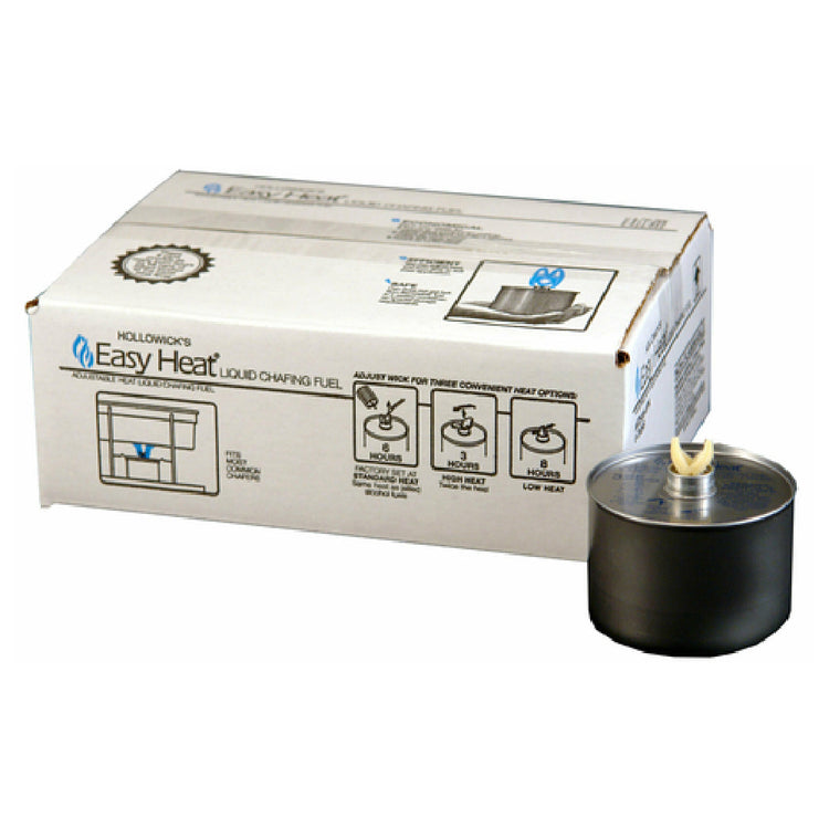 The Hollowick EZ638-6PK Easy Heat® Chafing Fuel is a highly efficient solution designed for a variety of food service needs, distinguished by its technical specifications and versatile functionality. Each fuel can is 9.7 ounces, with a diameter of 3-3/8 inches and a height of 2-3/8 inches, making it compact yet effective. This chafing fuel is particularly noted for its reusability, providing an economical and environmentally friendly option for businesses. It features an odorless burn, ensuring that the dining atmosphere remains pleasant and unaffected by fuel smells. The adjustable heat settings offer three distinct options, catering to different heating requirements, making it a flexible choice across various culinary applications. The stay-cool can design enhances safety, allowing for easy handling during use. Packaged in a self-merchandising carton containing six cans, it offers practical storage and display solutions. This makes the Hollowick EZ638-6PK suitable for catering services, buffets, and events where reliable and adjustable heat sources are essential for maintaining food temperature and quality, while also supporting safe and efficient operation, aligning with the needs of professional food service environments.