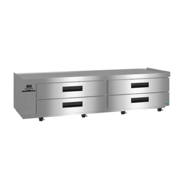Hoshizaki, CR98B-L, Steelheart® Series Refrigerated Equipment Stand, two-section, 98"W x 33-1/4"D x 27"H, (4) drawers: each will accommodate (3) 12” x 20” x 6” deep (pans not included), solid state digital controller with temperature alarms, LED display, stainless steel exterior front, sides, & top, stainless steel interior, side-mounted self-contained refrigeration, left side condenser, R290 Hydrocarbon refrigerant, 1/5 HP, 115v/60/1-ph, 3 amps, cord with NEMA 5-15P, (4) 4" casters, cETLus, ETL-Sanitation, ENERGY STAR®