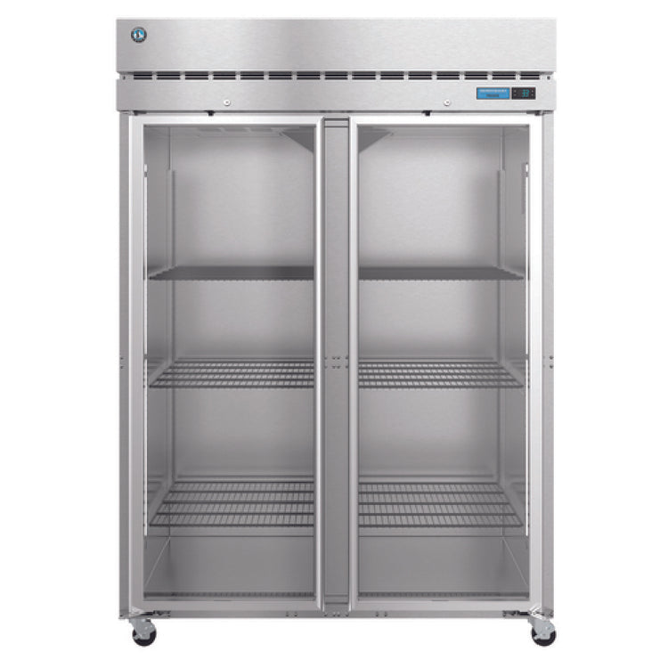 The Hoshizaki F2A-FG Steelheart Series Freezer Reach-in Two-section is a high-performance refrigeration unit ideal for commercial kitchens, offering a spacious 50.37 cu. ft. capacity to accommodate large volumes of perishable goods. Its top-mounted self-contained refrigeration system ensures efficient cooling, utilizing R290 Hydrocarbon refrigerant, which is environmentally friendly and energy-efficient. The unit is powered by a robust 1 HP motor, connected via a NEMA 5-15P plug. It features a solid state digital controller equipped with temperature alarms and an LED display for precise temperature management. The freezer is designed with (2) full-height hinged glass doors, providing easy access and visibility to stored items, while (6) epoxy coated wire shelves offer adjustable and durable storage solutions. Constructed with a stainless steel exterior front and sides, along with a stainless steel interior, it guarantees long-lasting durability and easy maintenance. The freezer is supported by (4) 4" heavy-duty casters, with (2) featuring brakes for stability and mobility. Certified by cETLus and ETL-Sanitation, this freezer meets high safety and sanitation standards, making it an excellent choice for restaurants, cafeterias, and other food service establishments requiring reliable and spacious cold storage.