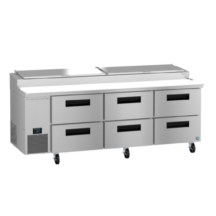 The Hoshizaki PR93B-D6 Steelheart Series Pizza Prep Table is a one-section unit boasting a substantial capacity of 29.34 cubic feet, tailored for the demands of professional kitchens in the pizza-making industry. This prep table features a nine 1/3 pan rail capacity, with pans and adapter bars included, ensuring seamless integration into any culinary operation. Equipped with six robust drawers, each capable of accommodating two 12" x 20" x 6" deep pans, this unit provides flexible storage options, though the pans themselves are not included. The design incorporates a 1/2-inch thick white polyethylene cutting board, offering a reliable and sanitary surface for food preparation. Constructed with a stainless steel exterior front, sides, top, and interior, the table promises durability and ease of cleaning, essential in high-volume food service environments. The self-contained refrigeration system employs R290 Hydrocarbon refrigerant, paired with a 1/3 horsepower compressor, delivering efficient cooling while being eco-friendly. It includes a power cord with a NEMA 5-15P plug, and is certified by cETLus and ETL-Sanitation, guaranteeing compliance with industry safety standards. The Hoshizaki PR93B-D6 is a versatile and indispensable asset for any commercial kitchen seeking reliability and functionality in their food preparation processes.