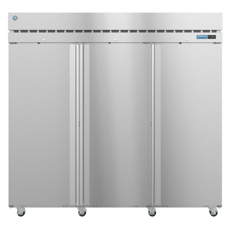 The Hoshizaki R3A-FS Steelheart Series Refrigerator is a reach-in, three-section unit with a spacious 79.03 cu. ft. capacity, tailored for commercial kitchens requiring efficient refrigeration solutions. This robust appliance features self-contained refrigeration and a solid state digital controller, equipped with temperature alarms and an LED display for precise climate management. Constructed with stainless steel interior and exterior (front and sides), it offers exceptional durability and hygiene. The standard depth refrigerator includes three field reversible solid doors and nine adjustable shelves, accommodating flexible storage needs. For mobility and stability, it is fitted with eight 4" heavy-duty casters, three of which have brakes. The refrigerator utilizes environmentally-friendly R290 Hydrocarbon refrigerant and is powered by two 1/4 HP compressors. It is equipped with a NEMA 5-15P plug and meets cETLus and ETL-Sanitation standards, ensuring high performance and safety. This Hoshizaki model is an ideal choice for various segment markets within the foodservice industry, providing reliable and energy-efficient cold storage solutions.