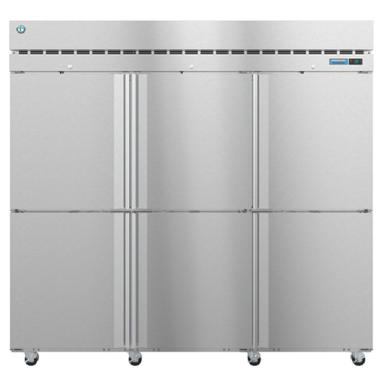The Hoshizaki R3A-HS Steelheart Series Refrigerator is a reach-in, three-section unit designed for commercial environments that require efficient and reliable refrigeration solutions. With a substantial capacity of 79.03 cubic feet, it provides ample storage space for a variety of perishable items, making it an asset for restaurants, hotels, and other food service establishments. Its self-contained refrigeration system and use of R290 Hydrocarbon refrigerant highlight its commitment to eco-friendly operations. The refrigerator is equipped with a solid state digital controller, featuring temperature alarms and an LED display, ensuring precise temperature management. A durable stainless steel interior and exterior (front and sides) offer both resilience and ease of cleaning. The unit's standard depth design is complemented by six half-height hinged solid doors, providing flexible access options. Inside, nine adjustable shelves allow for customizable storage arrangements, while eight 4-inch heavy-duty casters (three with brakes) facilitate mobility and stability. Powered by two 1/4 HP compressors and equipped with a NEMA 5-15P plug, the refrigerator meets cETLus and ETL-Sanitation standards, ensuring it adheres to rigorous safety and sanitation requirements. This refrigerator is a robust solution for businesses prioritizing efficiency, capacity, and environmental sustainability.