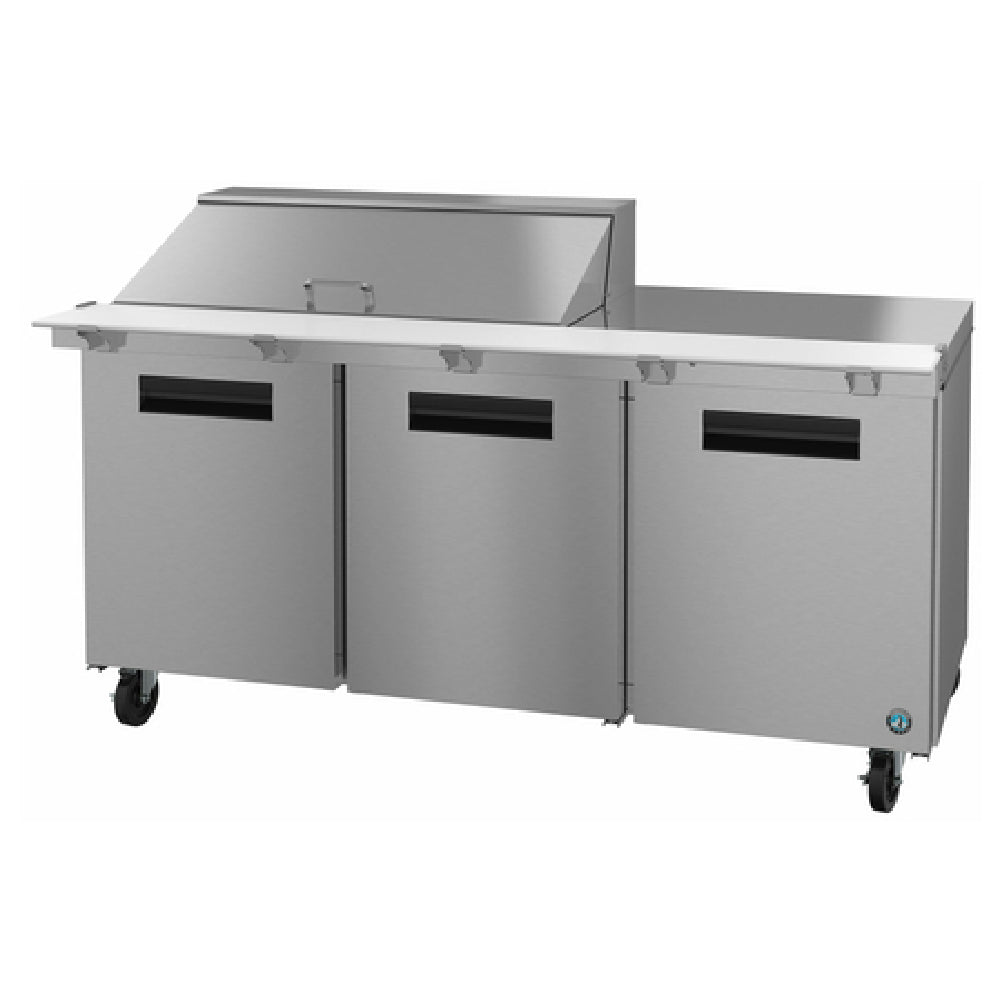 The Hoshizaki SR72B-18M Steelheart Series Mega Top Refrigerator is a versatile, reach-in, three-section unit ideal for commercial kitchens requiring efficient and adaptable storage solutions. Measuring 72 inches in width with a spacious 21.25 cubic feet capacity, this refrigerator is equipped with a self-contained, rear-mounted refrigeration system. Its three solid hinged doors provide easy access to three adjustable shelves, accommodating diverse storage needs. Notably, the top rail is configured with eighteen 1/6 pans, each 4 inches deep, with a maximum pan depth of 6 inches, ensuring optimal organization. A 10-inch deep by 1/2-inch thick white polyethylene cutting board is included, along with a comprehensive set of adapter bars, enhancing its utility in food preparation. Constructed with a stainless steel interior and exterior, including front, sides, and a hinged top cover, it is designed for durability and ease of cleaning. The refrigerator is mounted on four 6-inch casters, two of which have brakes for stability and mobility. Utilizing R290 Hydrocarbon refrigerant and powered by a 1/3 HP motor, it operates efficiently with a NEMA 5-15P plug. Certified by cETLus and ETL-Sanitation, the Hoshizaki SR72B-18M meets stringent safety and sanitation standards, making it a reliable choice for various sectors within the food service industry.
