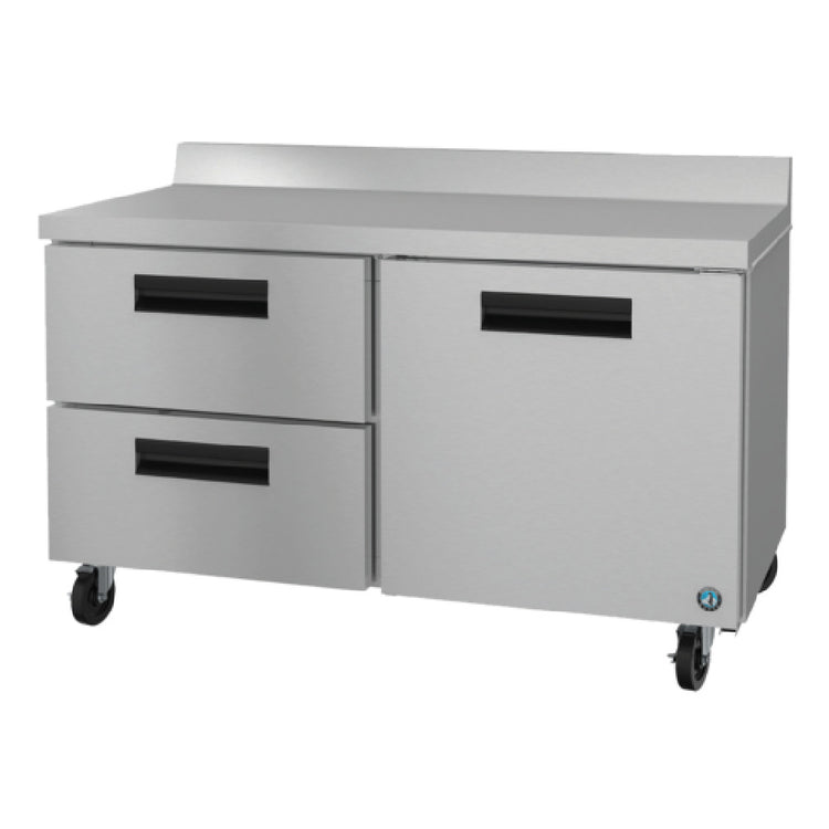 The Hoshizaki WR60B-D2 Steelheart Series Worktop Refrigerator is a versatile two-section unit, measuring 60 inches in width and offering a spacious 17.55 cubic feet capacity. It is equipped with a self-contained rear-mounted refrigeration system, enhancing its efficiency and reliability. The unit features a solid hinged door alongside an adjustable shelf, providing flexible storage options, complemented by two practical drawers. Constructed with a robust stainless steel interior and exterior, including the front, sides, and top, this refrigerator ensures durability and ease of maintenance. The WR60B-D2 is mounted on four 6-inch stem casters, two of which are equipped with brakes, allowing for effortless mobility and secure placement. It employs a hot gas condensate removal system and utilizes R290 Hydrocarbon refrigerant, which is environmentally friendly. Powered by a 1/5 HP motor, it comes with a cord and NEMA 5-15P plug for ease of installation. This refrigerator is certified by cETLus and ETL-Sanitation, underscoring its compliance with industry standards. A notable feature for businesses is the made-to-order option, which requires a 4-6 week lead time, allowing customization to fit specific needs within the food service and hospitality sectors.