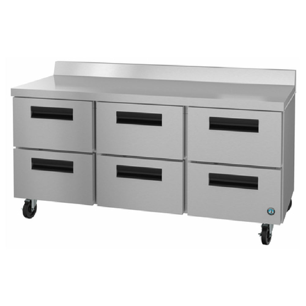The Hoshizaki WR72B-D6 Steelheart Series Worktop Refrigerator is a three-section unit with a width of 72 inches, engineered for professional kitchens requiring efficient cold storage solutions. This refrigerator boasts an impressive 18.27 cubic feet of storage capacity, making it suitable for various food service operations. Its self-contained rear-mounted refrigeration system utilizes R290 Hydrocarbon refrigerant, which is known for its environmentally friendly properties. The unit features six durable stainless steel drawers, providing organized and easy access to stored items. Both the interior and exterior are constructed from stainless steel, ensuring longevity and resistance to corrosion, while the front, sides, and top further contribute to its robust build. For mobility and stability, the refrigerator is equipped with four 6-inch stem casters, two of which include brakes. The integration of a hot gas condensate removal system enhances the unit's efficiency and maintenance. With a 1/5 horsepower compressor and NEMA 5-15P plug, the WR72B-D6 is cETLus and ETL-Sanitation certified, meeting rigorous safety and hygiene standards. This worktop refrigerator is an ideal choice for different market segments within the food service industry, offering versatile and reliable refrigeration performance.