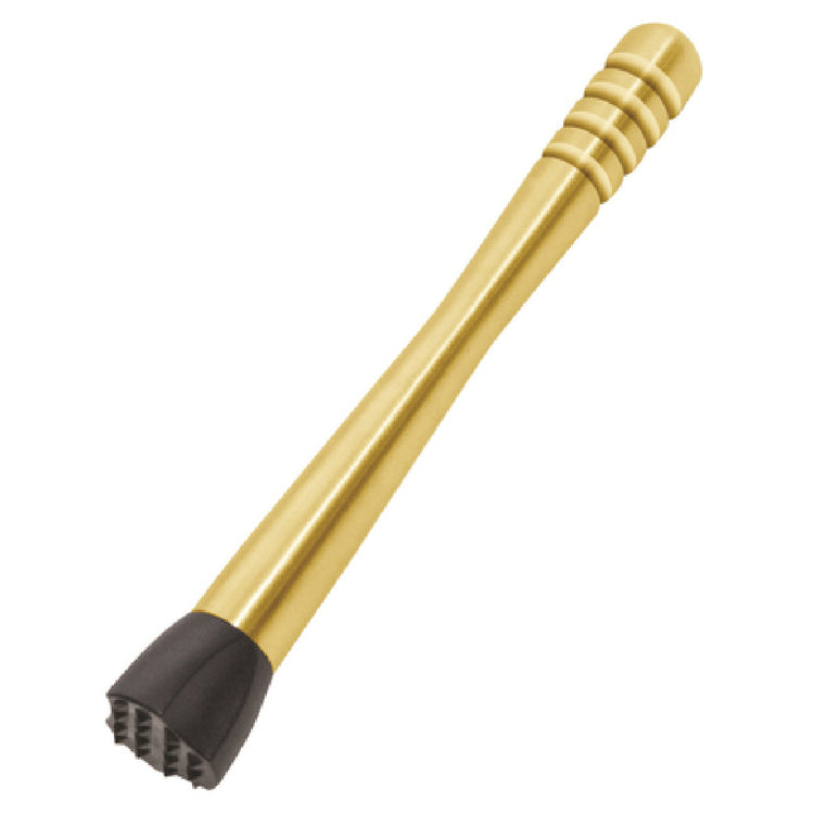 The Hospitality Brands HB46/BARSTIK-G-012 Uber Bar Tools™ Cocktail Essentials Barstik™ Muddler is crafted to elevate the cocktail crafting experience across various industry segments. This product features a compact design, making it a practical choice for busy bartending environments. The muddler incorporates a black plastic head, ensuring a gentle yet effective muddling process for a wide range of ingredients. Its construction is complemented by stainless steel, offering durability and resistance to corrosion, which is essential for prolonged use in high-demand settings. The stainless steel is finished in an elegant gold tone, adding a touch of sophistication and style to any bar setup. Each case contains 12 muddlers, making it a cost-effective purchase for establishments requiring multiple units. This product is part of Uber Bar Tools™ Cocktail Essentials, known for their quality and reliability in the hospitality industry. The combination of materials and design not only guarantees a superior performance but also presents a visually appealing tool that professionals can rely on. Whether for a high-end cocktail bar or a casual pub, this muddler serves as an indispensable instrument, promising both functionality and an enhanced aesthetic presence on the bar counter.