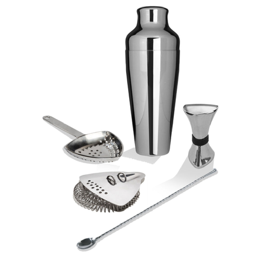 The Hospitality Brands HB46/PSS-001 Uber Bar Tools™ Cocktail Essentials ProShaker™ Set is a comprehensive 5-piece kit designed for professional and home bartenders alike, emphasizing durability and precision. This set includes the ProMegJig™ jigger, engineered for accuracy in cocktail measurements, and the BarRay™ cocktail strainer, which ensures effortless liquid separation for a polished pour. The ProTeardrop™ bar spoon, with its elegant design, facilitates seamless stirring and layering of ingredients. Additionally, the Juliep™ julep strainer is crafted for versatility in cocktail preparation, making it suitable for a variety of drinks beyond juleps. The set is completed by the M Shaker, made from high-quality stainless steel with a chrome finish, providing a sleek and sturdy shaking experience. Each tool in this set is meticulously designed to meet the exacting standards of the hospitality industry, offering unparalleled quality for cocktail enthusiasts and professionals. The combination of robust materials and thoughtful design positions this ProShaker™ Set as an essential toolkit for crafting impeccable cocktails, catering to the needs of bars, restaurants, and cocktail aficionados seeking precision and elegance in their beverage preparation.