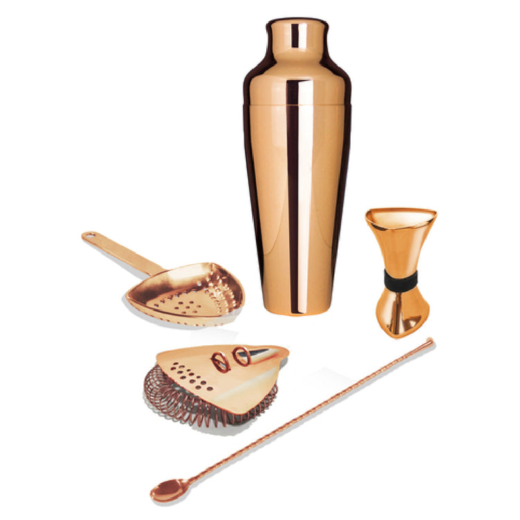 The Hospitality Brands HB46/PSS-C-001 Uber Bar Tools™ Cocktail Essentials ProShaker™ Set is a comprehensive 5-piece cocktail toolset designed for professional bartenders and cocktail enthusiasts alike. This meticulously crafted set includes the ProMegJig™ jigger, which ensures precision in measuring various cocktail ingredients. The BarRay™ cocktail strainer is an essential tool for achieving a smooth pour, effectively catching ice and fruit pieces. Enhancing the stirring process, the ProTeardrop™ bar spoon is crafted for optimal mixing and ease of use. Additionally, the Juliep™ julep strainer provides versatility for a variety of cocktail applications, especially those requiring a classic touch. Central to this set is the M Shaker, made from durable stainless steel with a copper finish, offering both aesthetic appeal and functionality. Whether in a high-paced bar environment or a home setting, this set caters to diverse market segments within the hospitality industry by combining professional-grade tools with elegant design. Its stainless steel and copper construction not only ensure longevity but also add a touch of sophistication to any bar setup, making it an invaluable asset for crafting premium cocktails with precision and style.