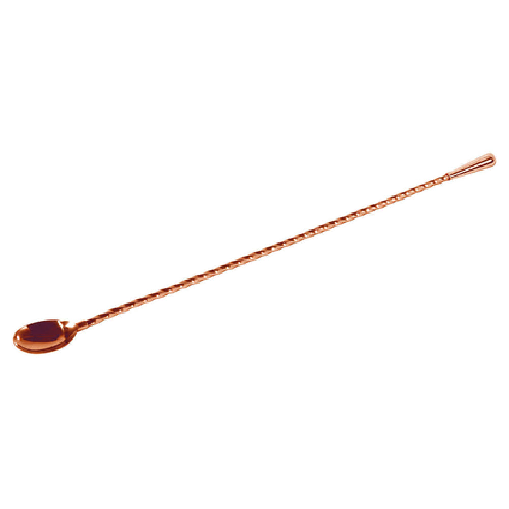 The Hospitality Brands HB46-TEARDROP-XL-C-012 Uber Bar Tools™ Cocktail Essentials ProTeardrop™ XL Bar Spoon is a specialized tool crafted for professional bartenders and cocktail enthusiasts. This bar spoon features a substantial length of 20L, making it an ideal choice for mixing drinks in taller glassware. The spoon is designed with a re-enforced spoon head and an elegantly shaped tear drop head, enhancing its functionality and durability in high-volume settings. The twisted shaft not only adds to its aesthetic appeal but also provides a better grip and efficient stirring action. Made from stainless steel, this bar spoon ensures long-lasting use and resistance to corrosion, while its striking copper finish gives it a sophisticated look, perfect for upscale bars and cocktail lounges. Packaged by case, each containing 12 units, this product is suited for large-scale operations and businesses looking to stock their bar with high-quality tools. Its design and composition make it a valuable asset for mixologists aiming to craft impeccable cocktails, providing both style and practicality in their barware collection.