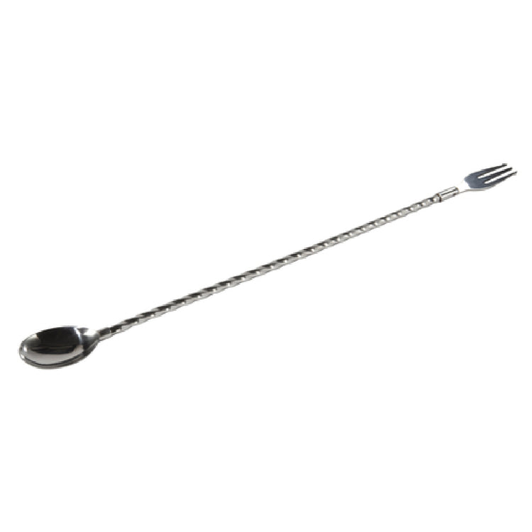 The Hospitality Brands HB46/TRIDENT-012 Uber Bar Tools™ Cocktail Essentials ProTrident™ Bar Spoon is a meticulously designed tool for bartenders and mixologists seeking precision and durability. This bar spoon measures 12 inches in length, providing the ideal reach for stirring and mixing in a variety of glass sizes. Crafted from high-quality stainless steel with a chrome finish, it ensures long-lasting performance and resistance to wear. The spoon features a reinforced head, combining a traditional spoon with a trident for enhanced versatility, allowing for both stirring cocktails and retrieving garnishes effortlessly. The twisted shaft design not only adds a touch of elegance but also provides grip and control during use, making it a functional choice for professional and home settings. Each case contains 12 bar spoons, facilitating bulk purchasing for high-volume establishments. The ProTrident™ Bar Spoon's robust construction and thoughtful design elements make it an essential tool within the barware industry, catering to the needs of cocktail enthusiasts and professional mixologists alike who demand reliability and efficiency in their craft.