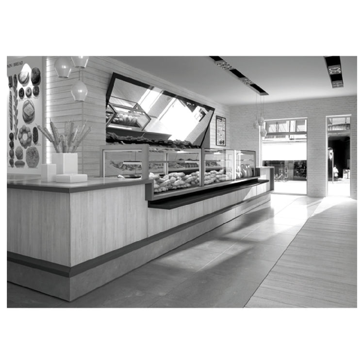 The Howard-McCray LAR-RVCH60-P20-46-79 24h La Rossa Pastry Display Case/Showcase-39.36" Length Without Panels is a sophisticated unit designed for effectively showcasing pastries and bakery products. This model features a combination of insulated, refrigerated deck drawer, and two non-refrigerated shelves, catering to diverse display needs. It employs a self-contained, air-cooled refrigeration system, ensuring energy-efficient operation. The display case is equipped with LED lighting, enhancing product visibility, and is constructed with tempered single pane glass on the front and double pane glass sides for durability and insulation. A hydraulic lift-up top glass and rear plexiglass sliding doors allow for easy access and service. Its digital diagnostic controls with programmable defrosting provide ease of maintenance. Constructed from 304 high gloss stainless steel interior and anodized aluminum, the unit promises longevity and a modern aesthetic. A stainless steel work surface adds to its functionality, making it suitable for both pastry and bakery service merchandising. The showcase operates on 220v/60/1-ph with a 12.0 amp power requirement, highlighting its efficiency in energy consumption. This display case caters to both large and small pastry businesses, providing a reliable and attractive solution for product presentation.