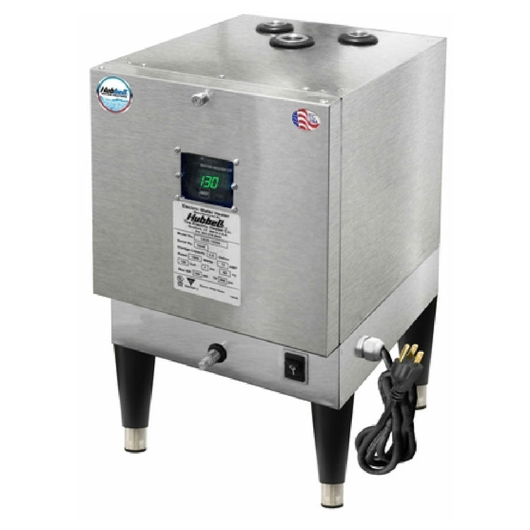 The Hubbell J25-750 Water Heater Electric Compact is a highly efficient water heating solution designed for small spaces, engineered with precision and quality. This compact unit operates with an electric power input of 0.75kW and features a 2.5-gallon storage capacity, making it ideal for applications where space is at a premium. The fully insulated stainless steel tank ensures durability and energy efficiency, while the electronic temperature controller with digital display offers precise temperature management within a range of 50° - 160°F. The inclusion of a thermostat control enhances usability across various applications. Safety is prioritized with a T&P relief valve, and the adjustable 6-inch plastic legs allow for easy installation and stability. Certified by cETLus and ETL-Sanitation, this water heater meets rigorous safety and sanitation standards, an essential feature for use in both residential and commercial settings. Proudly made in the USA, the Hubbell J25-750 Water Heater Electric Compact represents a reliable and versatile choice for industries requiring compact water heating solutions, from office buildings to small commercial kitchens, where efficient space utilization and dependable performance are critical. Its robust design and advanced features offer a compelling solution for diverse market needs within the water heating industry.