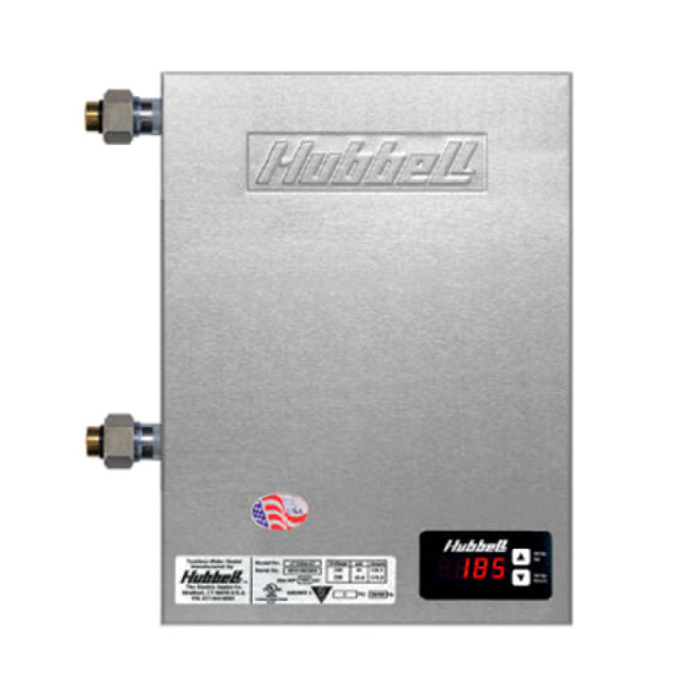The Hubbell JTX040-6RS Tankless Booster Heater Electric Wall Mount is engineered for precise and efficient water heating solutions across various industry segments. With a power output of 40.0kW, it incorporates six incoloy-sheathed heating elements, ensuring rapid and reliable heating performance. The unit features solid-state switches and an electronic digital display controller, providing precise temperature regulation and ease of use. An integral brass pressure reducing valve with a bypass option enhances control over water pressure, while the inclusion of two temperature and pressure gauges offers real-time monitoring capabilities. Dielectric unions are provided for reliable connections, contributing to the system's overall durability and safety. Encased in a robust stainless steel exterior, the Hubbell JTX040-6RS is designed for wall mounting, optimizing space utilization in crowded environments. Operating on a 208v/60/1-ph configuration and drawing 192.0 amps, it meets the rigorous standards of UL, cUL, and UL EPH (ANSI NSF 5) certifications, attesting to its compliance with safety and health regulations. This tankless booster heater is particularly suited for commercial and industrial applications requiring efficient water heating solutions, making it an invaluable asset in settings where consistent temperature control and reliability are paramount.