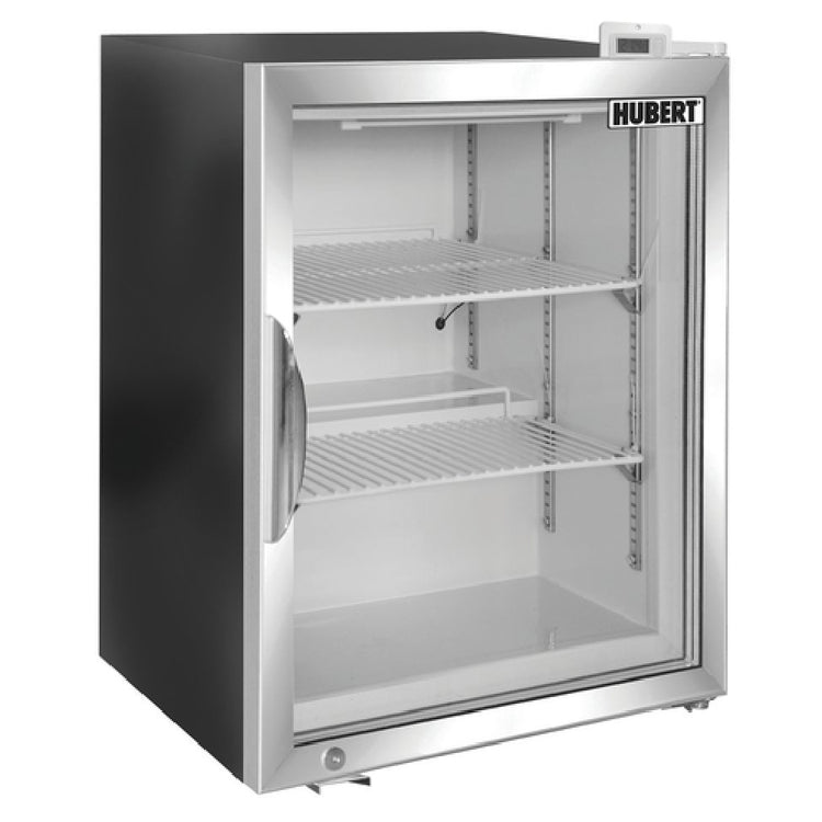 Hubert Company LLC, 10554, Freezer Merchandiser, countertop, 1-section, 3-1/10 cu. ft., 24-2/5"W x 21-2/5"D x 28"H, triple pane right hinged glass door (locking), (2) removable shelves, digital display & controls, LED interior light, automatic defrosting, temperature range: -3° to 0°F, bottom mount self-contained refrigeration system, adjustable feet, ABS plastic interior, black painted steel exterior, 1/4 HP, 115v/60/1-ph, 2 amp, 341 BTU, NEMA 5-15P, UL, UL EPH