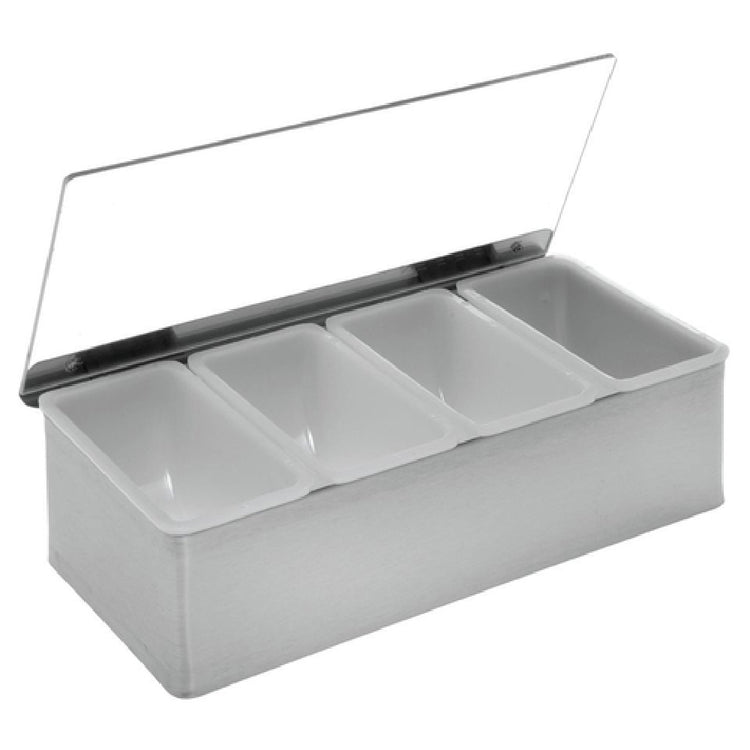 Hubert Company LLC, 15160, Condiment Holder, 12" x 5-1/2" x 3"H, with (4) plastic pint inserts, bottomless, acrylic hinged lid, dishwasher safe, stainless steel
