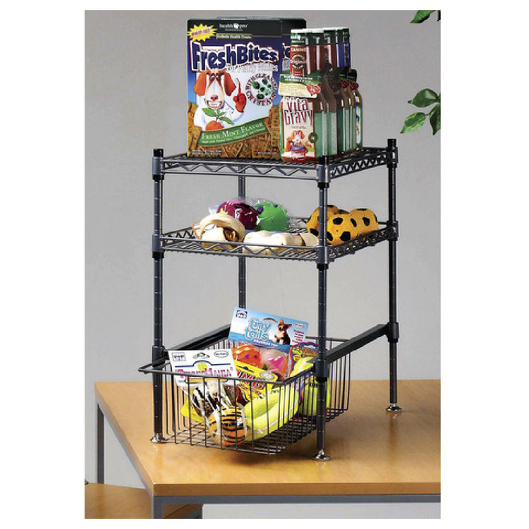 Hubert Company LLC, 52520, Display Shelf Rack & Basket, 3-tier, 18" x 12" x 18-1/2"H, rectangular, (2) adjustable shelves & (1) 5" basket, 3/16" wire spacing, 1" lip, aluminum-plated steel, silver