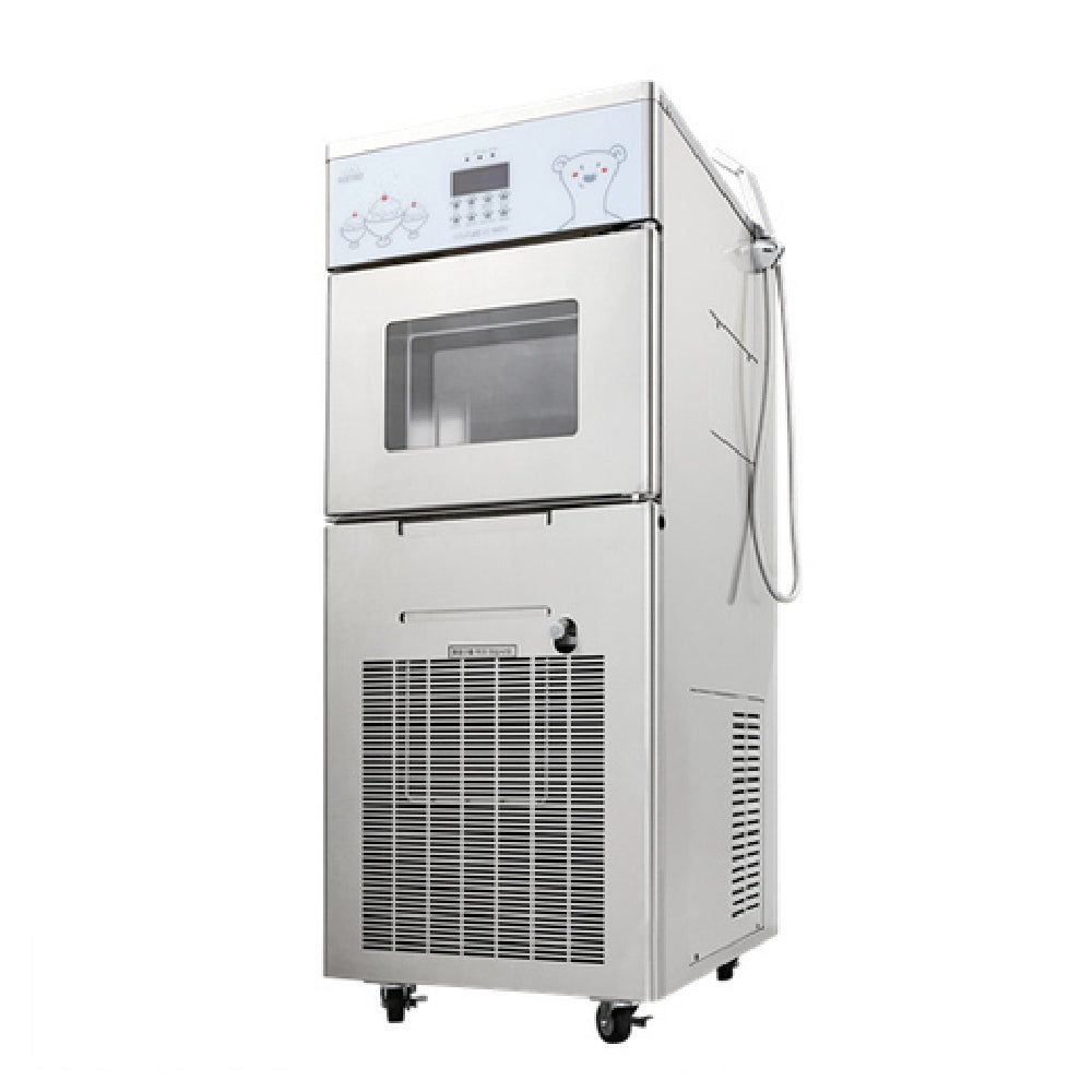 The Icetro IS-0700-AS Snow Flake Ice Machine is a high-capacity ice maker designed to produce snow-like soft ice. With its air-cooled, self-contained condenser, this machine is engineered for efficiency and reliability. It boasts an impressive production capacity of 705 lbs of water-snow and 1091 lbs of milk-snow per 24-hour cycle, catering to various commercial needs. The 14-gallon storage capacity ensures that ample ice is always on hand. Built with a 304 stainless steel construction, this ice machine offers durability and resistance to corrosion. It features a digital control panel for easy operation and precision in settings. The Icetro IS-0700-AS utilizes R-404A refrigerant, known for its effectiveness in temperature regulation. It is equipped with 3-inch casters, providing mobility and convenience in positioning within any kitchen or service area. The unit operates at 208-230 volts, 60 Hz, and is single-phase, making it compatible with standard power requirements. This machine meets CE, cETLus, and ETL-Sanitation standards, ensuring compliance with safety and sanitation regulations. Perfect for cafes, restaurants, and food service establishments, the Icetro IS-0700-AS is a reliable choice for producing high-quality, snow-like ice.