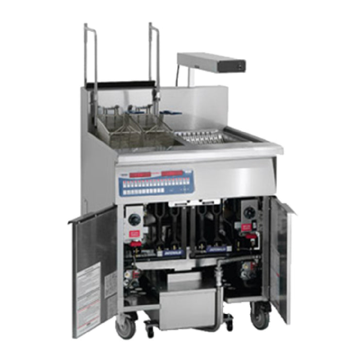 The Imperial IFSCB150-OP-C_NAT Fryer Gas Floor Model is a high-capacity kitchen appliance tailored for commercial cooking environments, offering a substantial 50 lb. frying capacity. This open pot fryer is enhanced by an integrated filter system, featuring a 5.5 GPM roller pump that optimizes oil management, thereby increasing efficiency and reducing waste. The inclusion of computer controls further ensures precise cooking operations. This model is equipped with a drain station and storage cabinet, providing practical solutions for oil disposal and utensil organization. It includes beneficial add-ons such as a food warmer and a dump pan, along with joiner strips and a filter starter kit for immediate use. Noteworthy for its robust construction, the fryer has a stainless steel frypot and exterior, including the front, sides, landing ledge, and cabinet, ensuring durability and ease of maintenance. The unit is designed with mobility in mind, featuring casters for flexible placement in busy kitchens. Operating at 140,000 BTU with a power requirement of 120v/60/1-ph and 6.8 amps, the IFSCB150-OP-C_NAT is also cETLus and ETL-Sanitation certified, ensuring compliance with safety standards. This fryer is an ideal choice for a variety of food service establishments seeking reliability and performance.