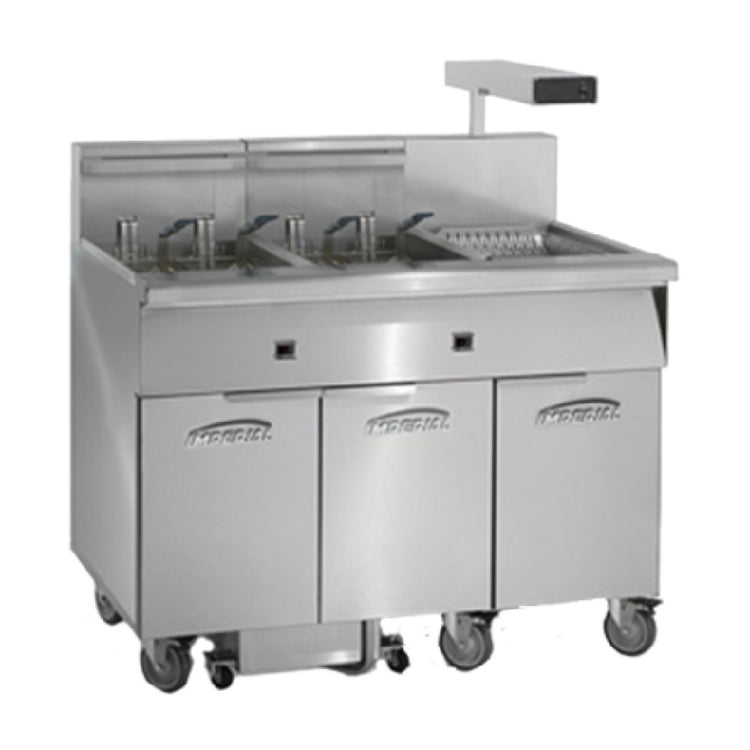 The Imperial IFSCB650EUT_240/60/3 Fryer Electric Floor Model is a high-performance kitchen appliance engineered for commercial use, specifically designed to deliver efficiency and precision in food service environments. This electric fryer model features a six-battery configuration, each with a substantial 50-pound capacity, making it suitable for high-volume frying operations. Equipped with tilt-up elements and a built-in filter system, it ensures seamless maintenance and optimal frying conditions. The built-in dump station and 5.5 GPM roller pump enhance operational efficiency, while the electronic thermostat offers precise temperature control. The fryer also includes valuable accessories such as a food warmer, dump pan, joiner strips, and a filter starter kit, adding to its comprehensive utility. Constructed with robust stainless steel for the frypot, front, and sides, and supported by casters for mobility, it combines durability with ease of movement. Additionally, the 1/3 HP power rating ensures reliable performance. The Imperial IFSCB650EUT_240/60/3 meets stringent safety and sanitation standards, being certified by cETLus, CSA Flame, CSA Star, CSA-Sanitation, and CE, making it a versatile and indispensable appliance for various segments within the food service industry, including restaurants, catering services, and large-scale kitchen operations.