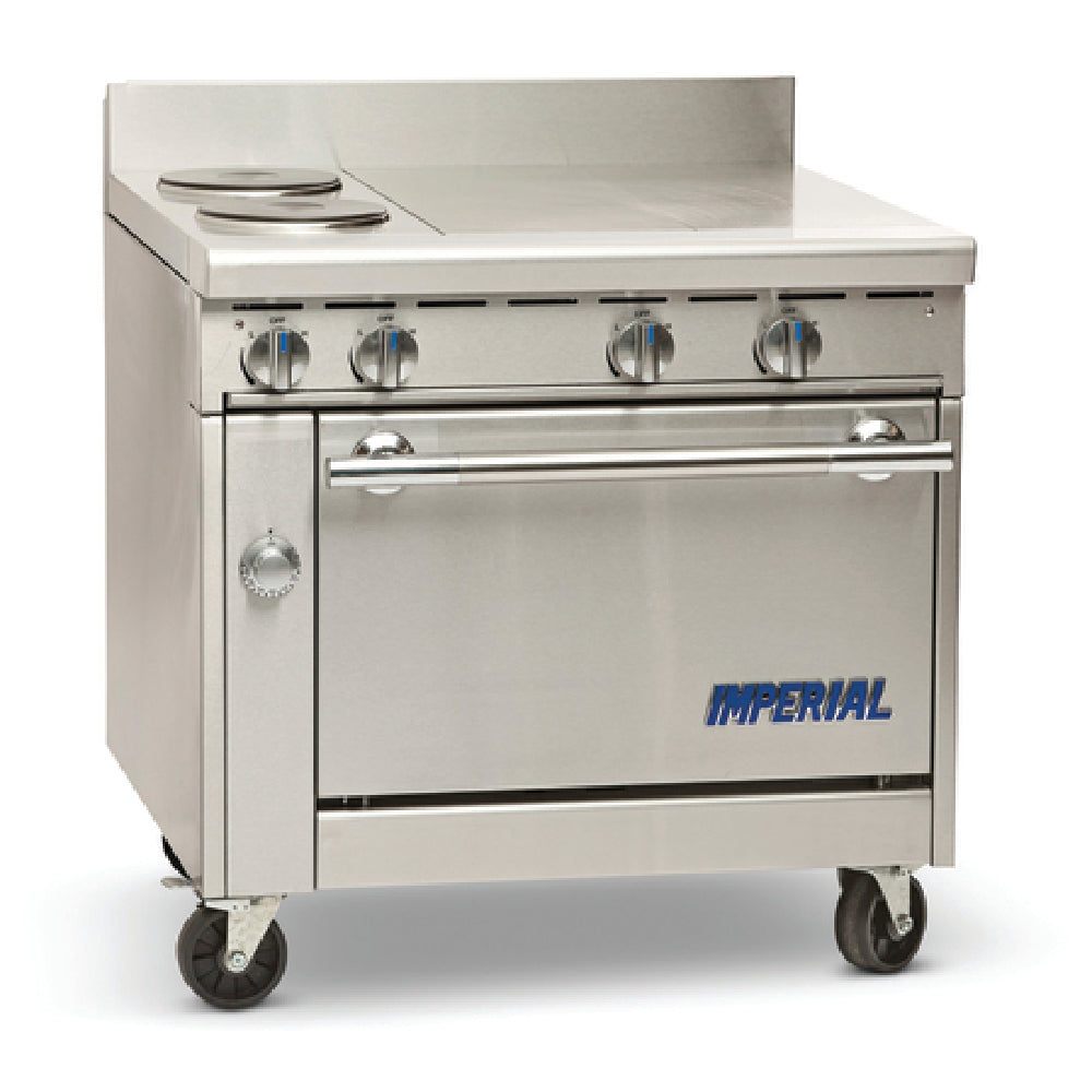 The Imperial IHR-2HT_LP Spec Series Heavy Duty Range Gas 36" is a versatile and reliable cooking solution, ideal for commercial kitchen environments. This gas range features two 18-inch hot tops that provide an expansive cooking surface, allowing chefs to manage multiple dishes simultaneously with ease. The range includes a standard oven that is equipped with a single chrome rack, offering flexibility in cooking and baking processes. With manual controls, operators can adjust settings accurately, ensuring precision in cooking. The unit's robust construction is highlighted by a stainless steel front, sides, landing ledge, backguard, and kick plate, enhancing durability and ease of maintenance. The range stands on 6-inch legs with adjustable feet, providing stability on uneven kitchen floors. With a powerful output of 120,000 BTU, it supports high-intensity cooking needs efficiently. Certified by both cETLus and NSF, this range complies with essential safety and sanitation standards, making it a trustworthy choice for various food service operations. Its solid construction and high-capacity features make the Imperial IHR-2HT_LP a valuable asset for restaurants, catering services, and other industrial kitchen settings, where heavy-duty performance and reliability are crucial.